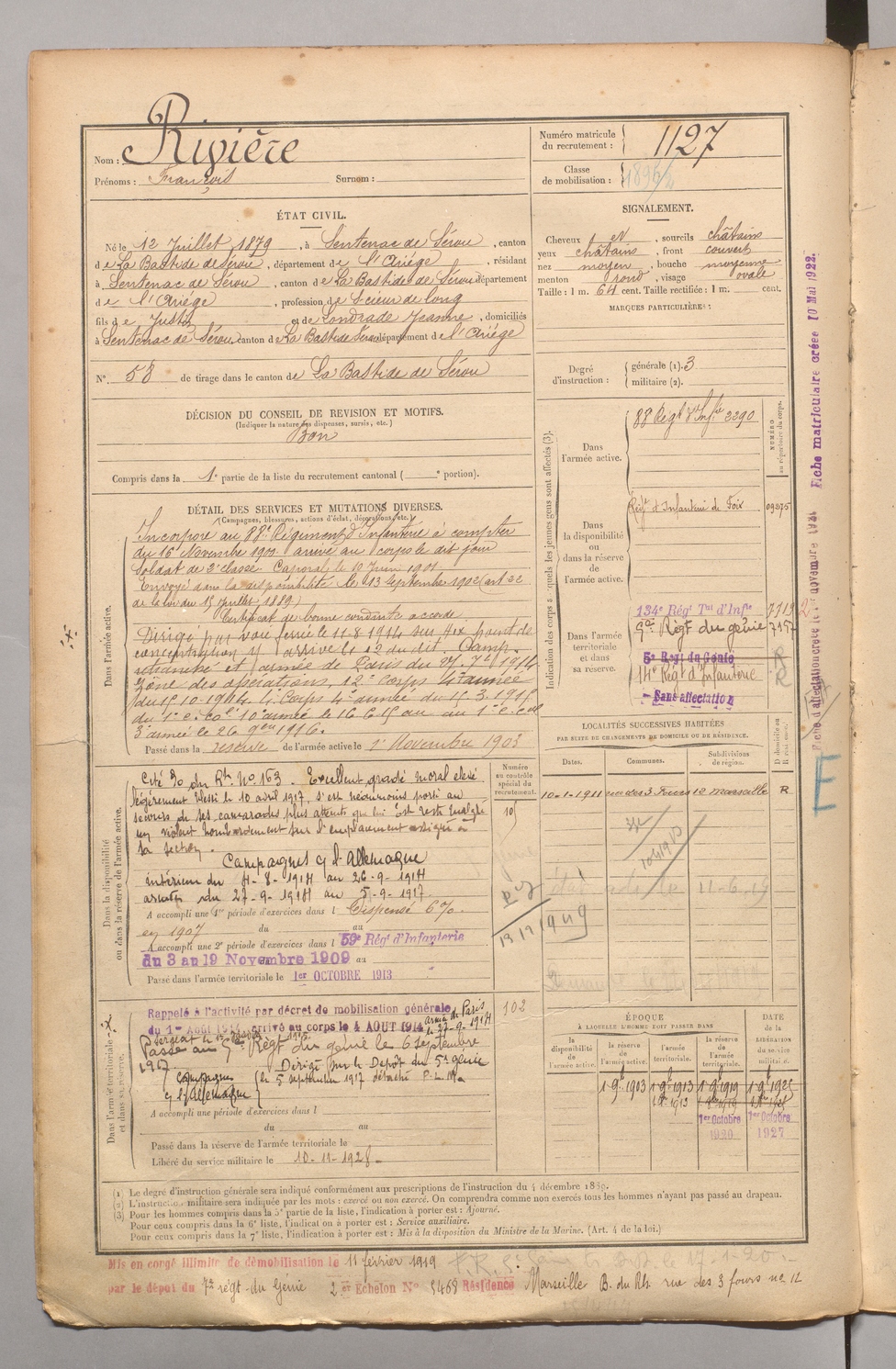 | Rivière | François | FOIX | 1 R 458 | 1899 | Sentenac-de-Sérou | Sentenac-de-Sérou | 1127 |