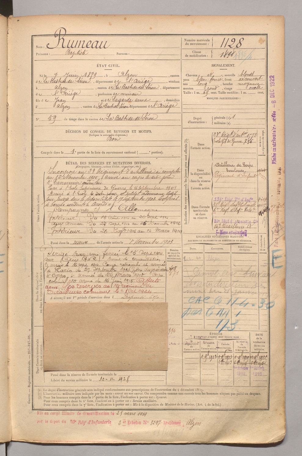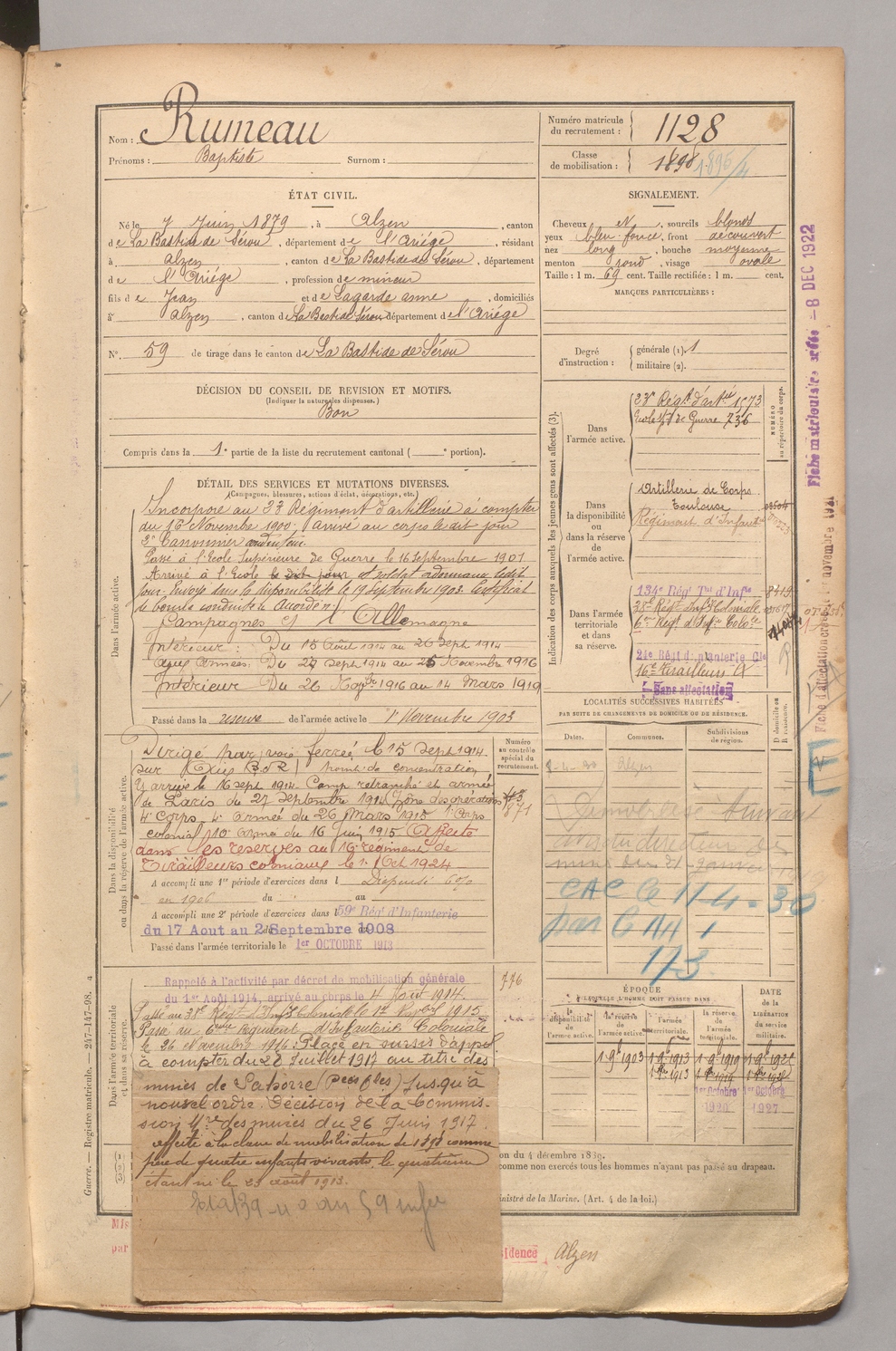 | Rumeau | Baptiste | FOIX | 1 R 458 | 1899 | Alzen | Alzen | 1128 |