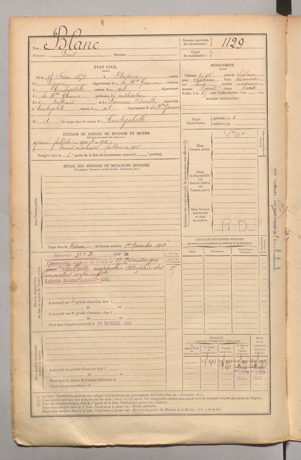 | Blanc | Louis | FOIX | 1 R 458 | 1899 | Plaisance | Cintegabelle | 1129 |