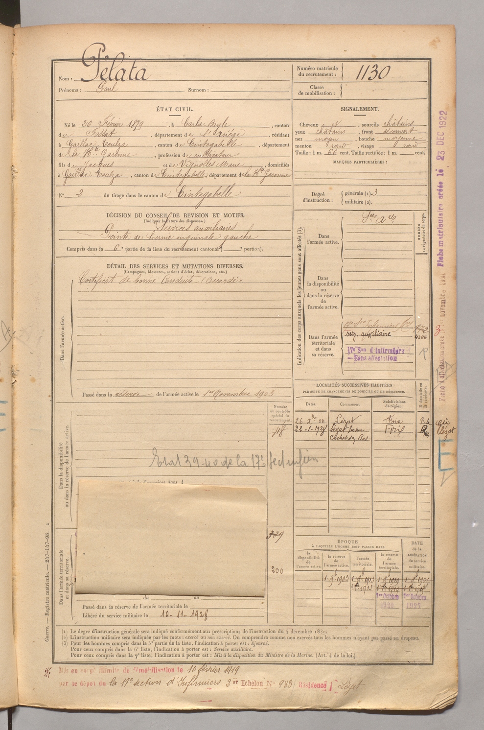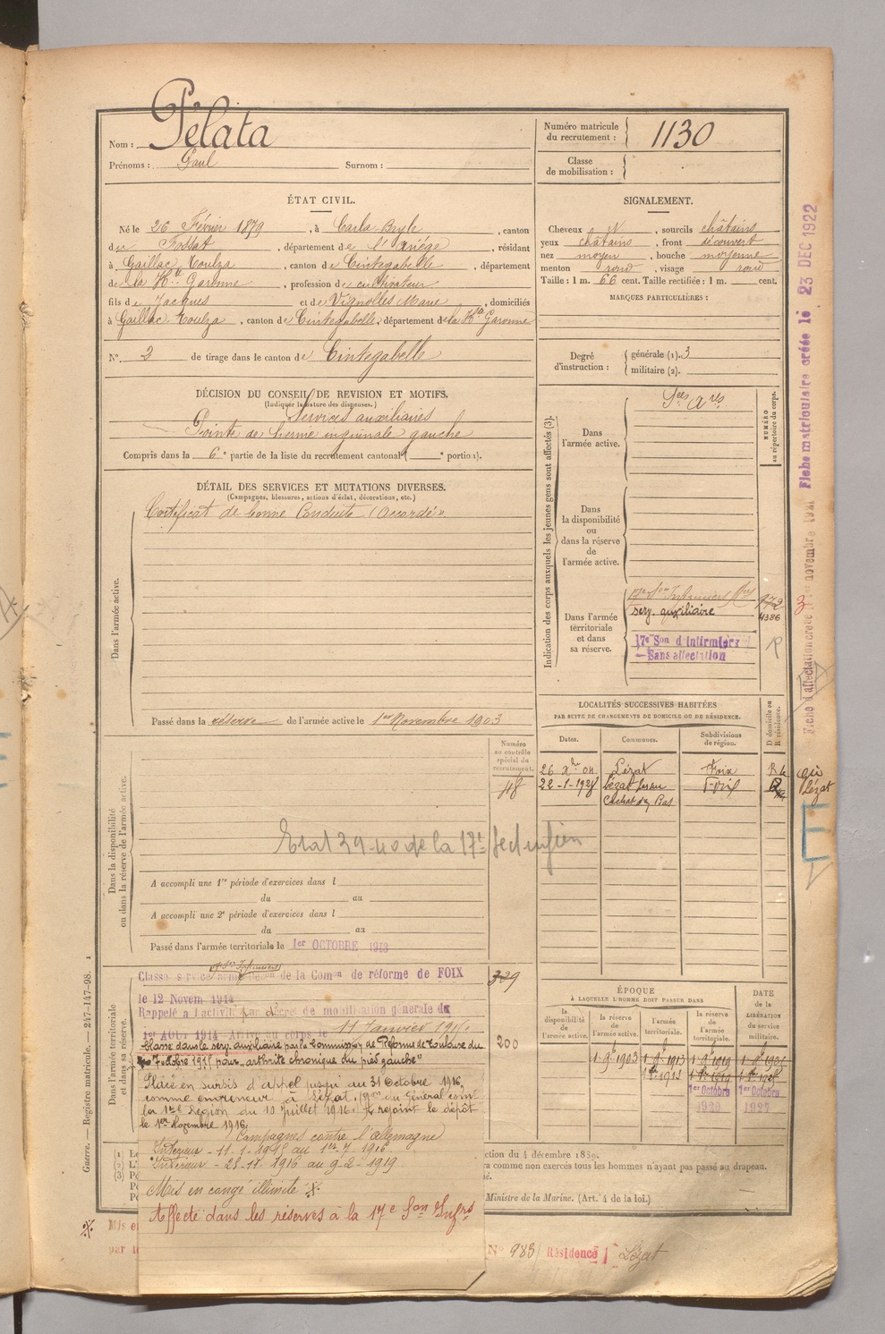 | Pélata | Paul | FOIX | 1 R 458 | 1899 | Carla-Bayle (Le) | Gaillac-Toulza | 1130 |