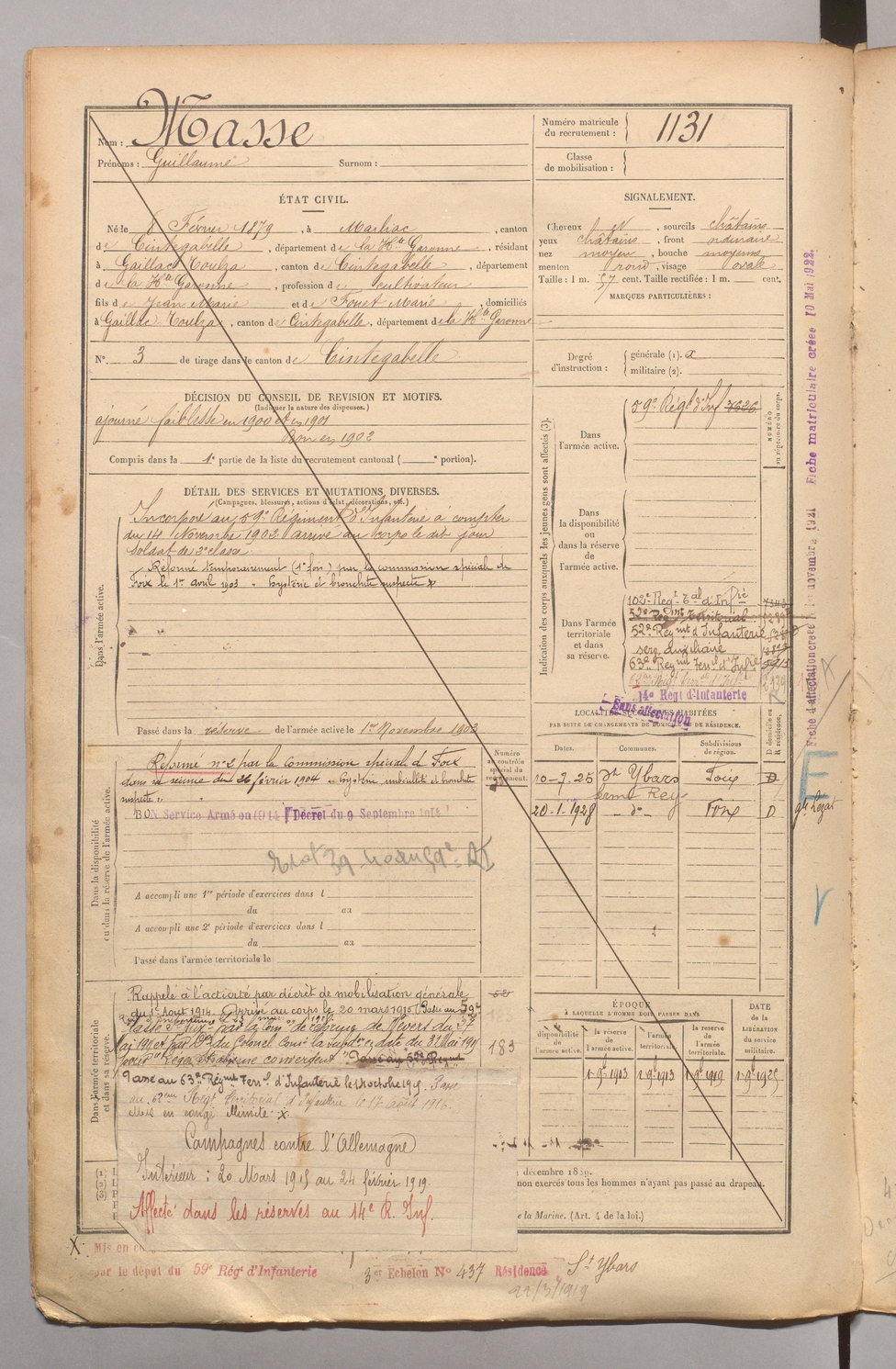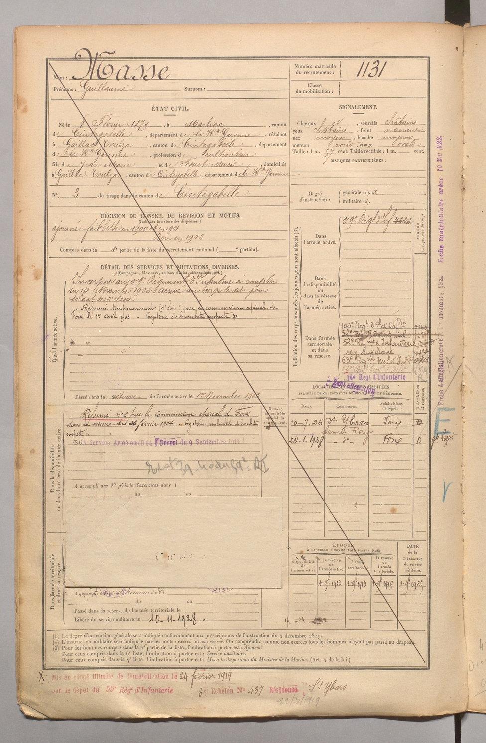 | Masse | Guillaume | FOIX | 1 R 458 | 1899 | Marliac | Gaillac-Toulza | 1131 |