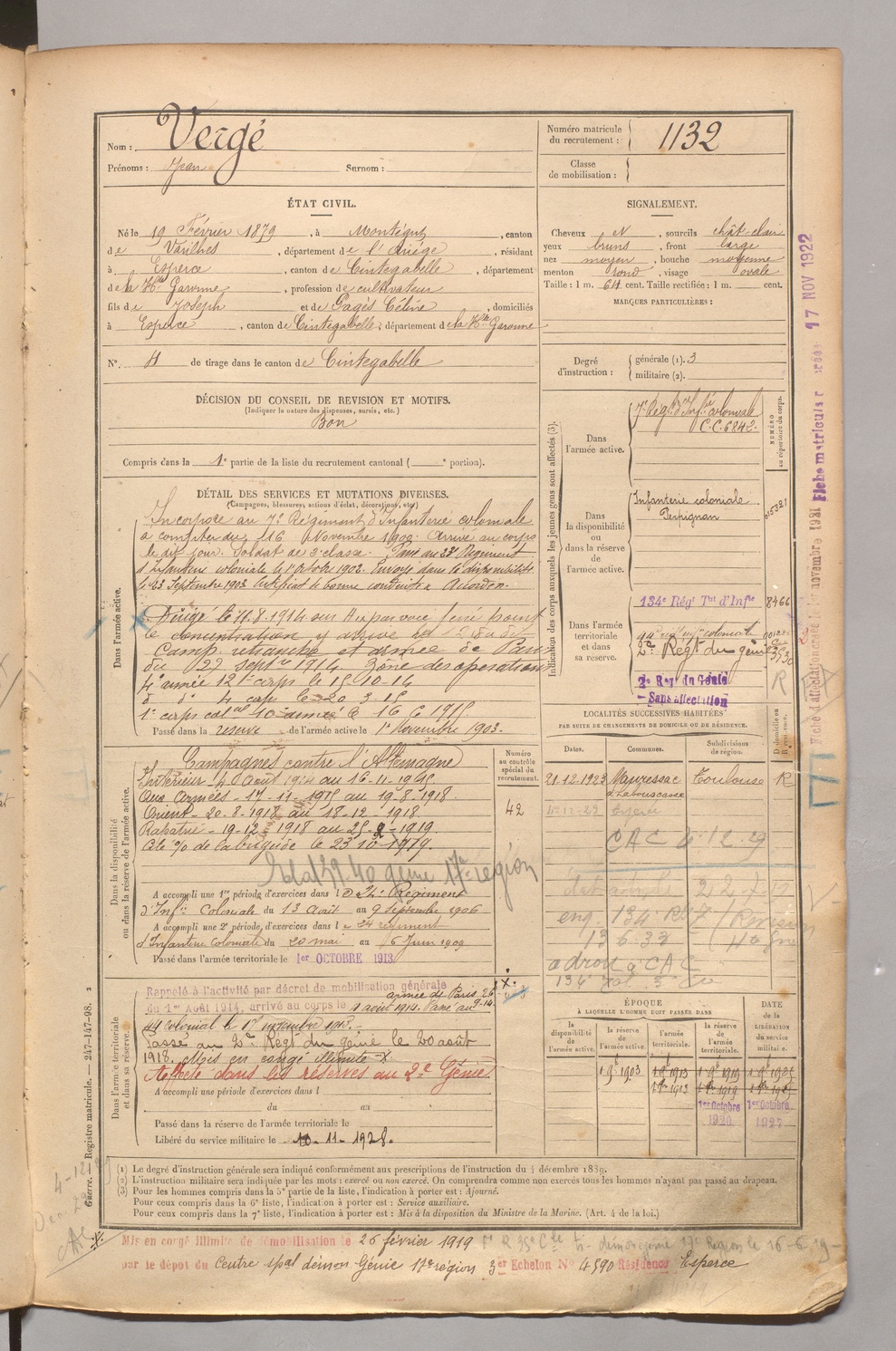 | Vergé | Jean | FOIX | 1 R 458 | 1899 | Montégut-Plantaurel | Esperce | 1132 |