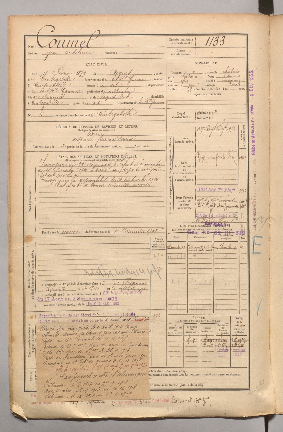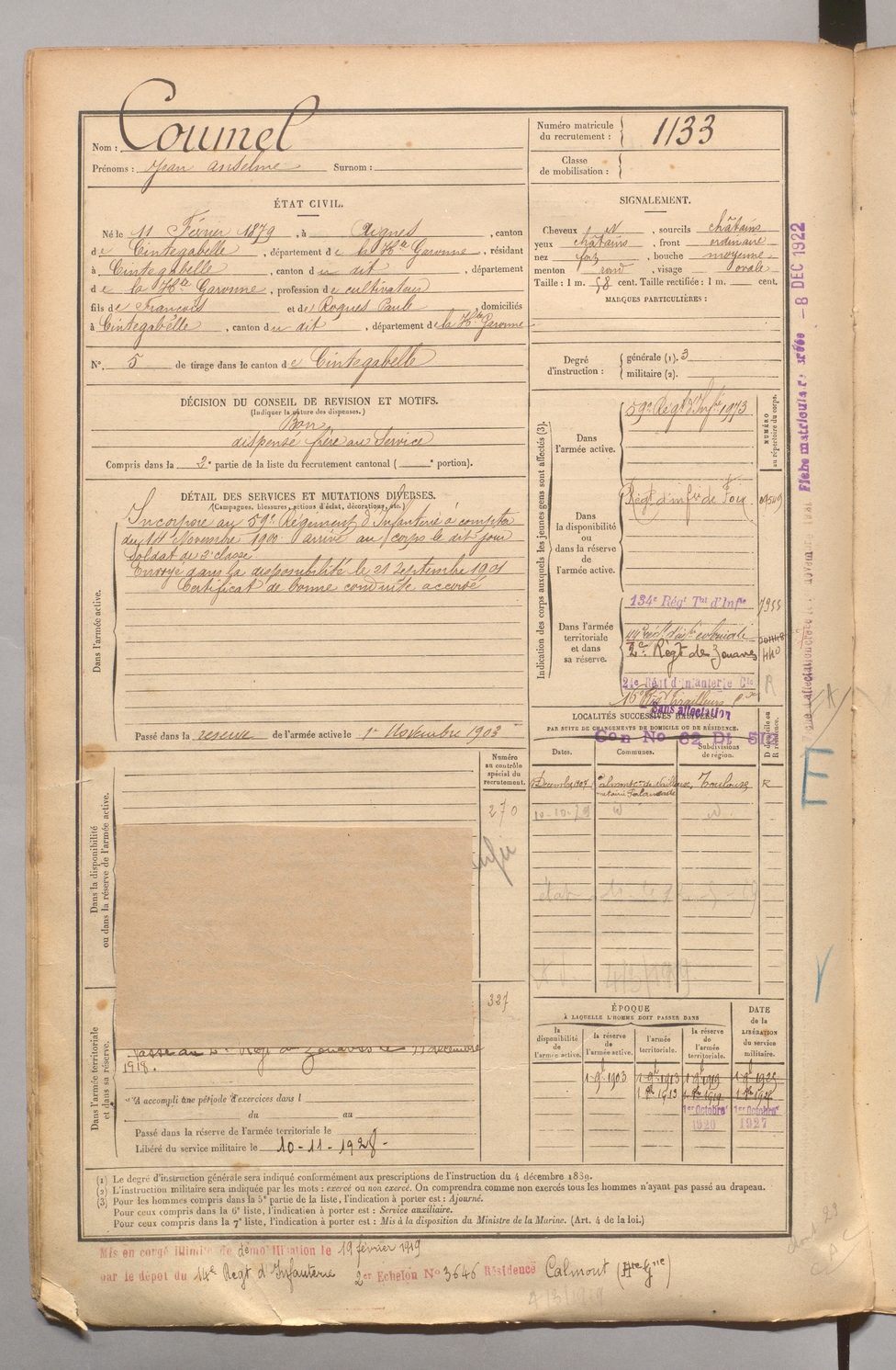 | Coumel | Jean Anselme | FOIX | 1 R 458 | 1899 | Aignes | Cintegabelle | 1133 |
