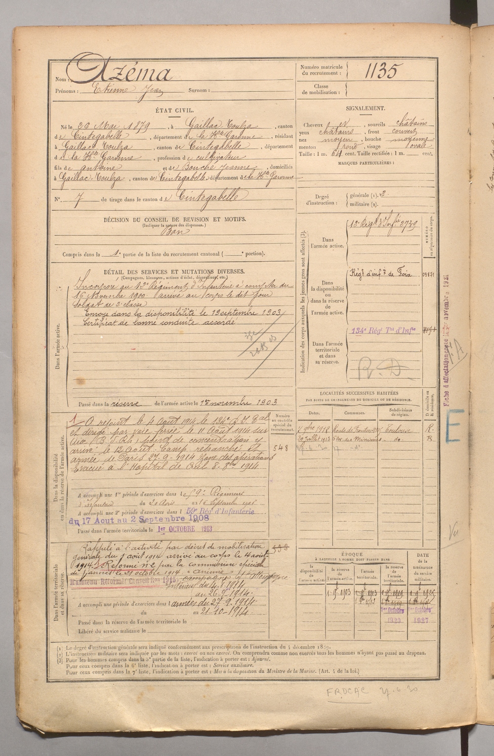 | Azéma | Etienne Jean | FOIX | 1 R 458 | 1899 | Gaillac-Toulza | Gaillac-Toulza | 1135 |