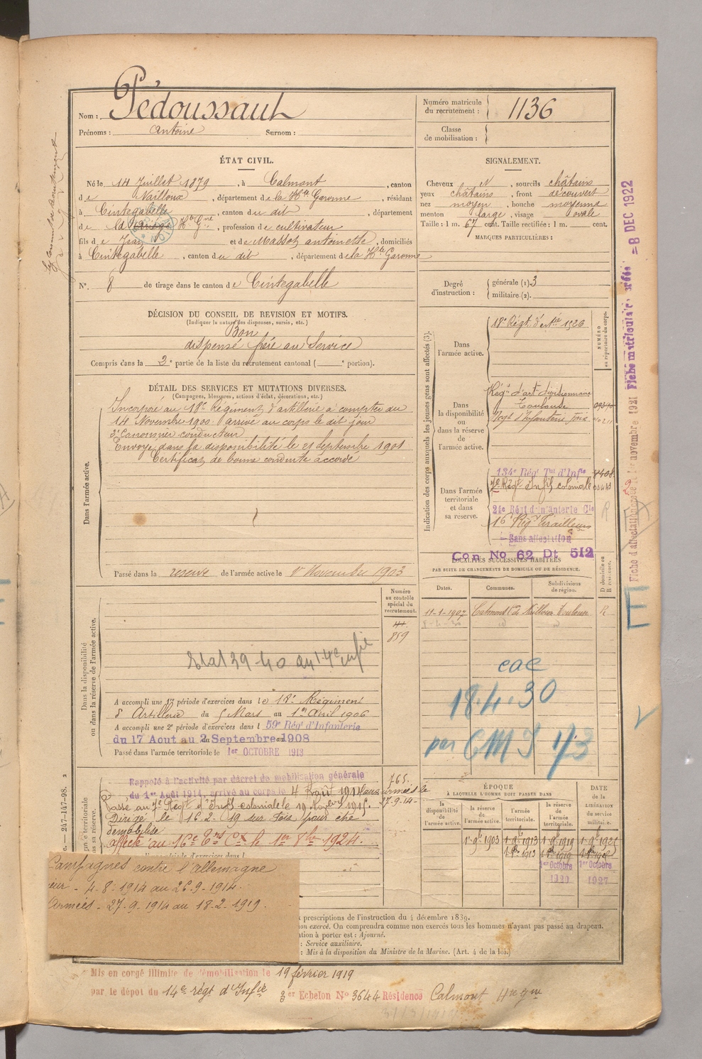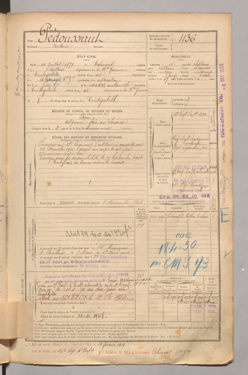 | Pédoussaut | Antoine | FOIX | 1 R 458 | 1899 | Calmont | Cintegabelle | 1136 |