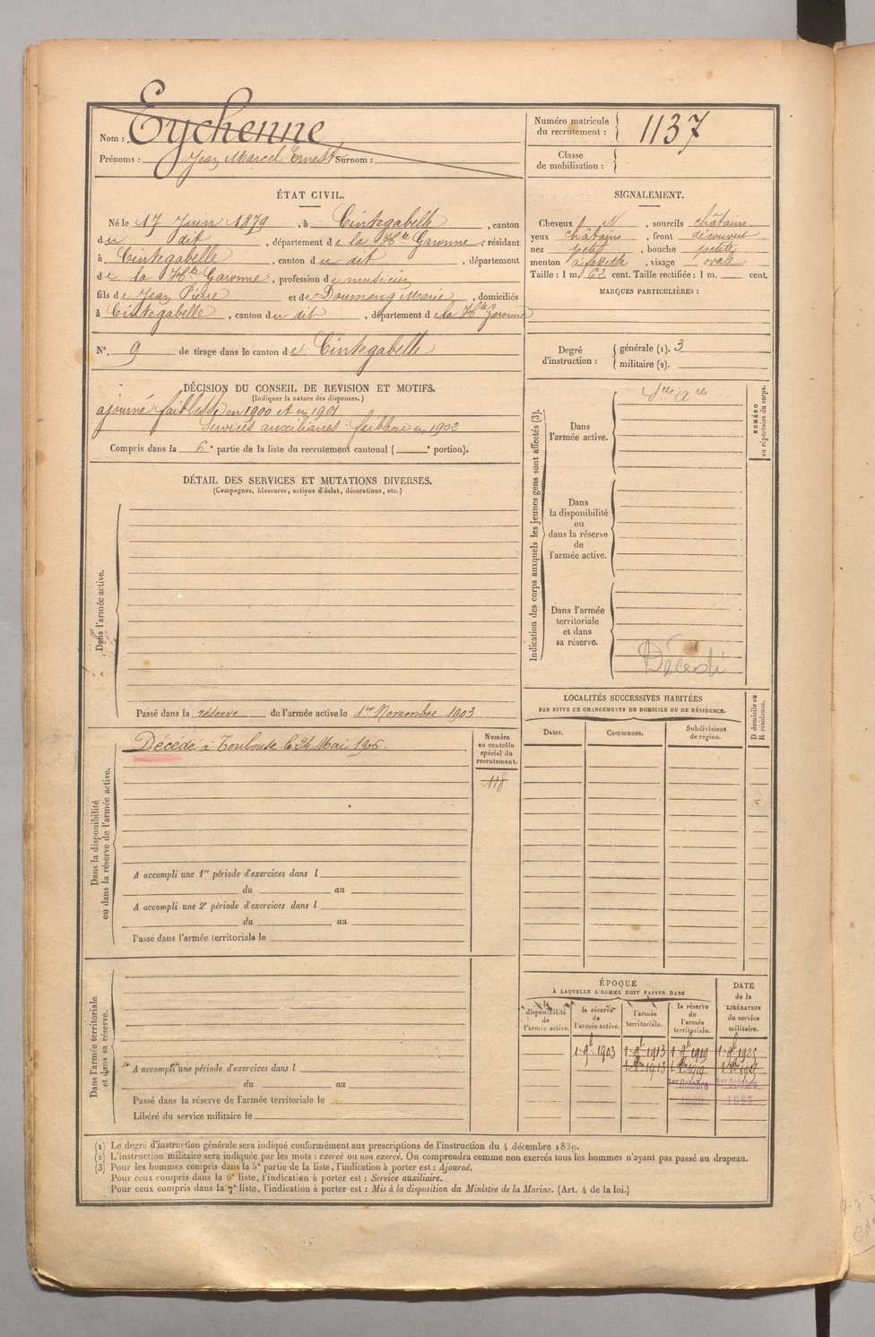| Eychenne | Jean Marcel Ernest | FOIX | 1 R 458 | 1899 | Cintegabelle | Cintegabelle | 1137 |