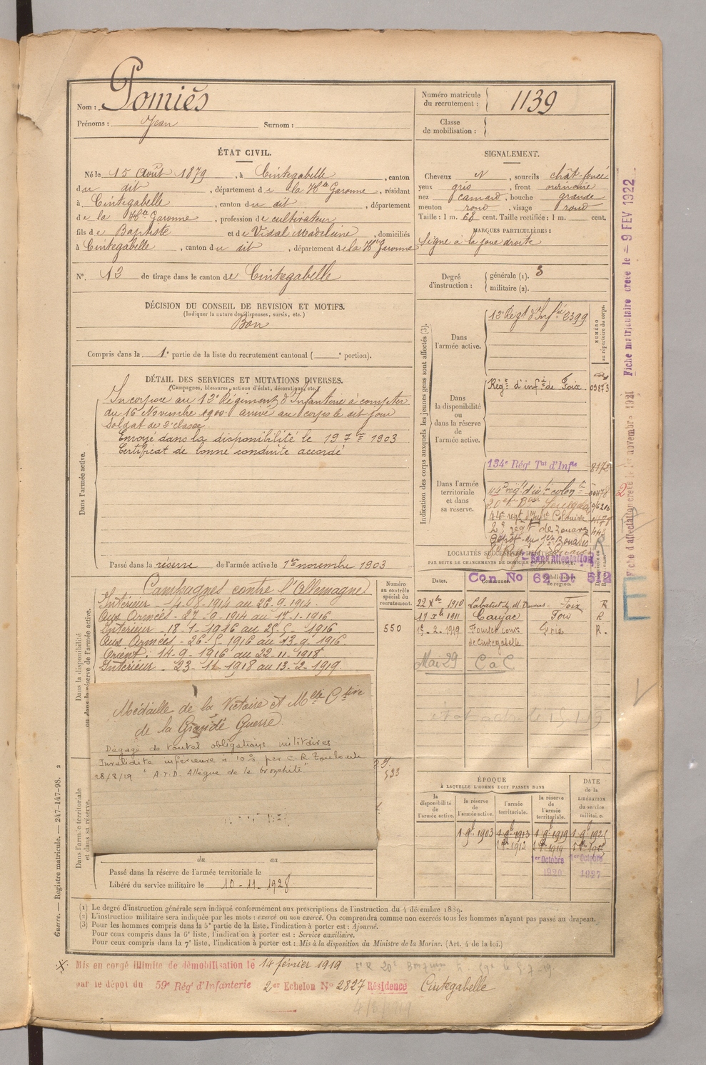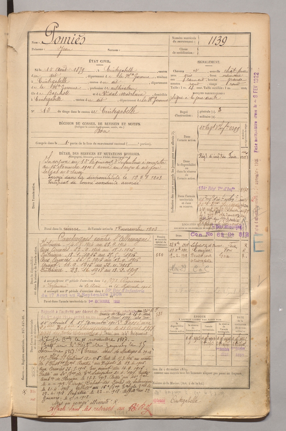 | Pomiès | Jean | FOIX | 1 R 458 | 1899 | Cintegabelle | Cintegabelle | 1139 |