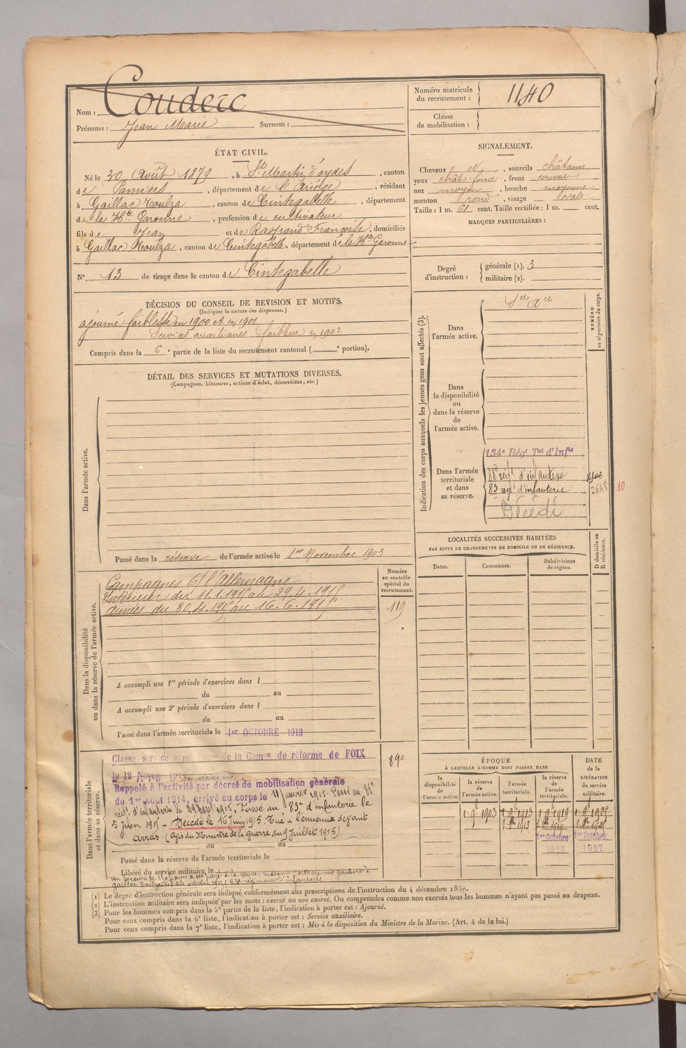 | Couderc | Jean Marie | FOIX | 1 R 458 | 1899 | Saint-Martin-d'Oydes | Gaillac-Toulza | 1140 |
