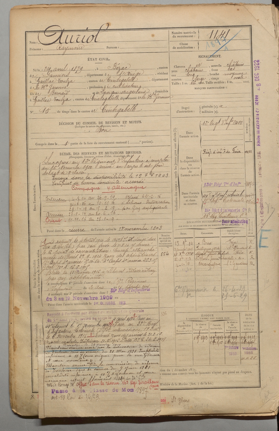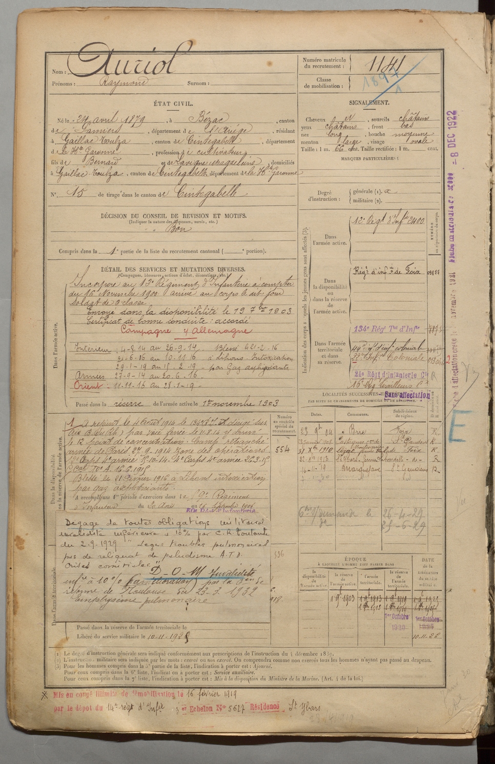 | Auriol | Raymond | FOIX | 1 R 458 | 1899 | Bézac | Gaillac-Toulza | 1141 |