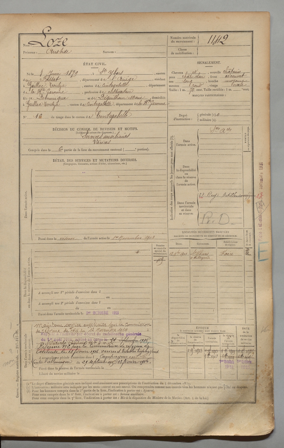| Loze | Aristide | FOIX | 1 R 458 | 1899 | Saint-Ybars | Gaillac-Toulza | 1142 |