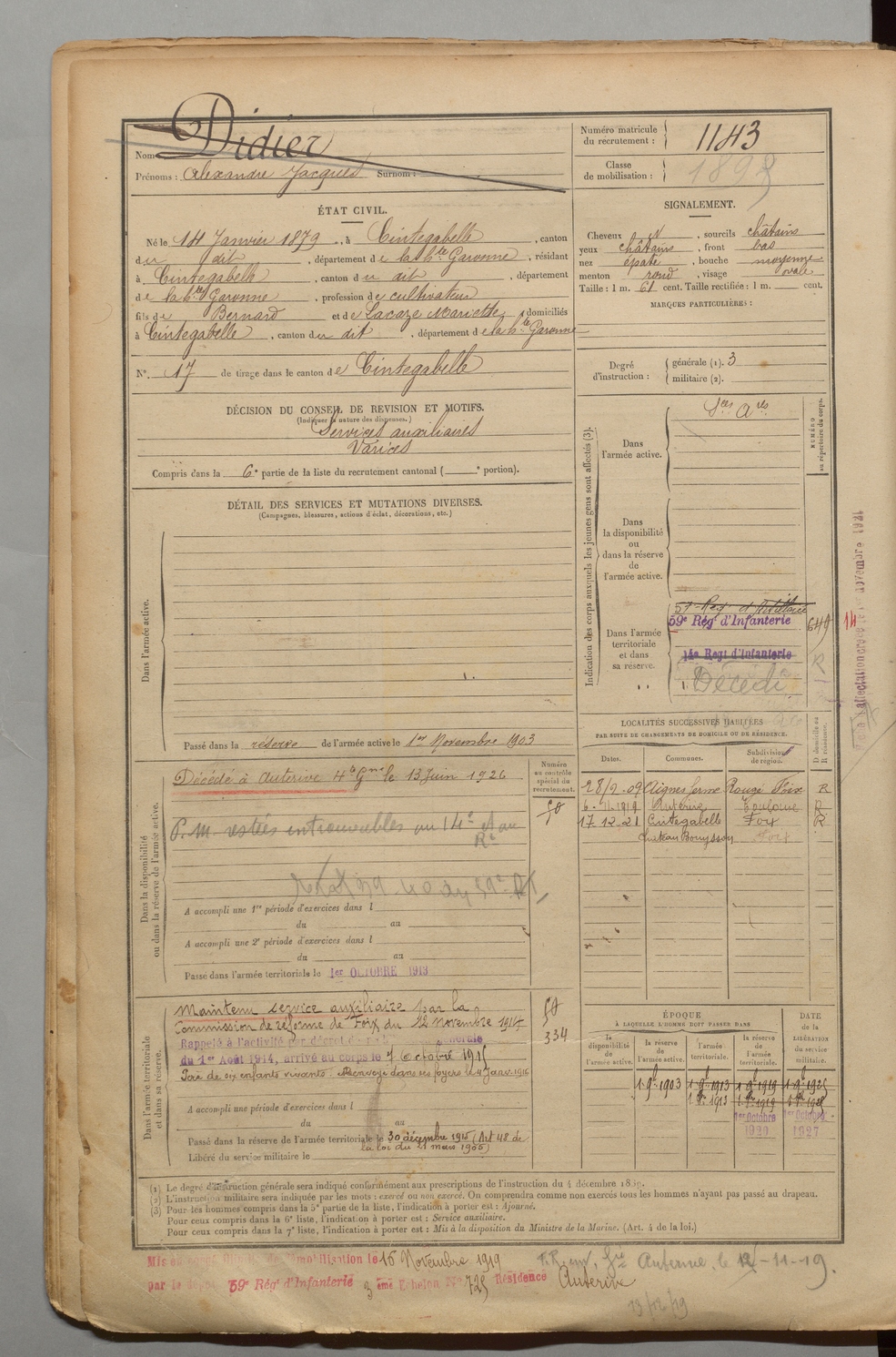 | Didier | Alexandre Jacques | FOIX | 1 R 458 | 1899 | Cintegabelle | Cintegabelle | 1143 |