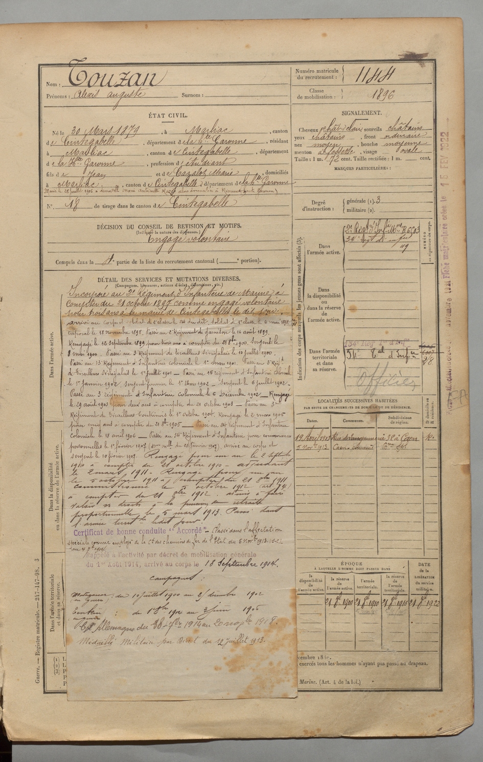 | Touzan | Alexis Auguste | FOIX | 1 R 458 | 1899 | Marliac | Marliac | 1144 |
