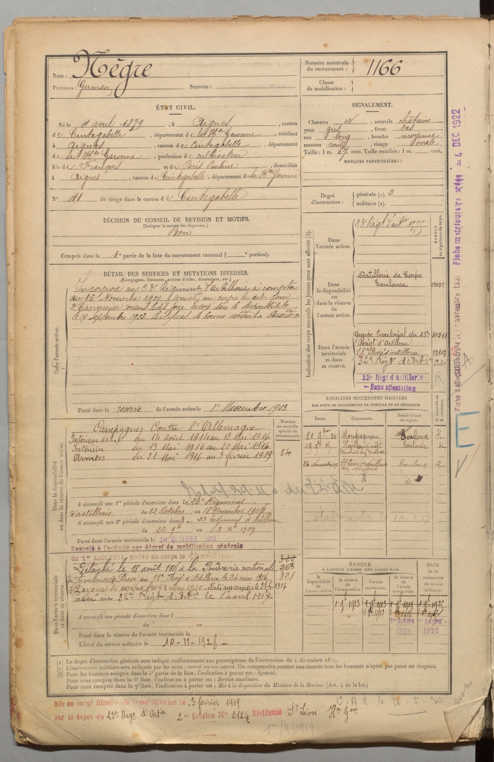| Nègre | Germain | FOIX | 1 R 458 | 1899 | Aignes | Aignes | 1166 |