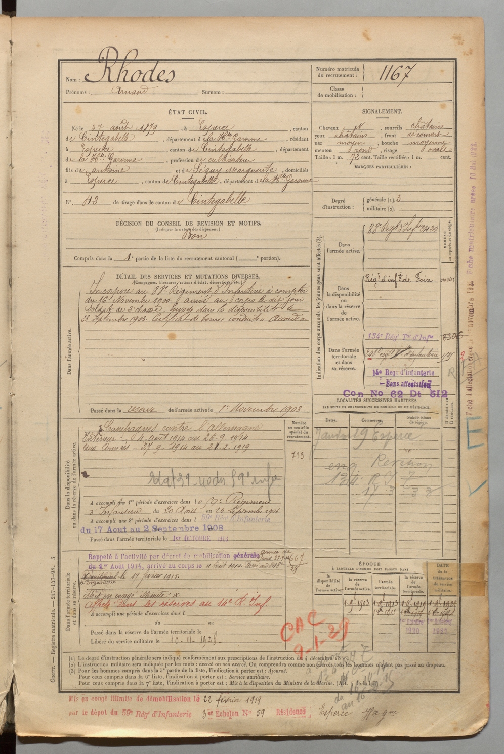 | Rhodes | Arnaud | FOIX | 1 R 458 | 1899 | Esperce | Esperce | 1167 |