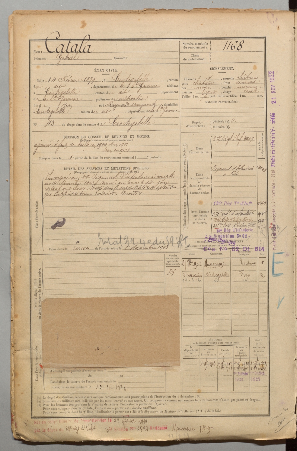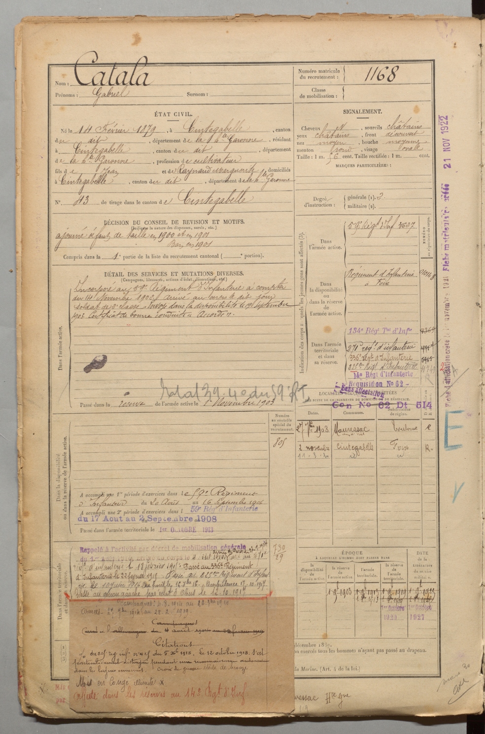 | Catala | Gabriel | FOIX | 1 R 458 | 1899 | Cintegabelle | Cintegabelle | 1168 |