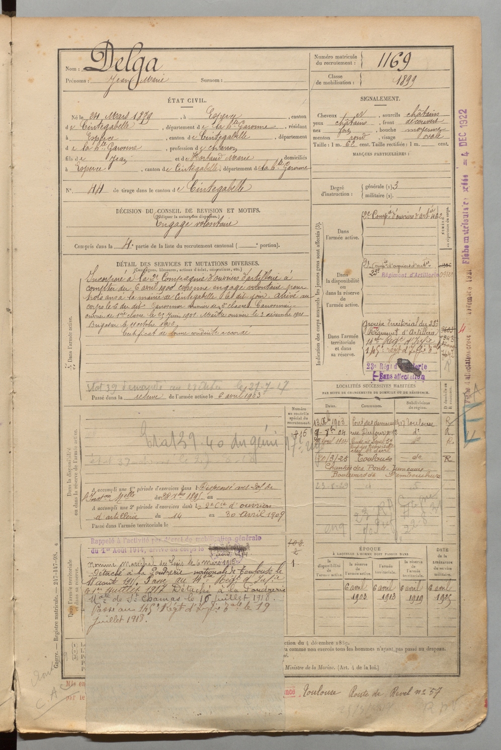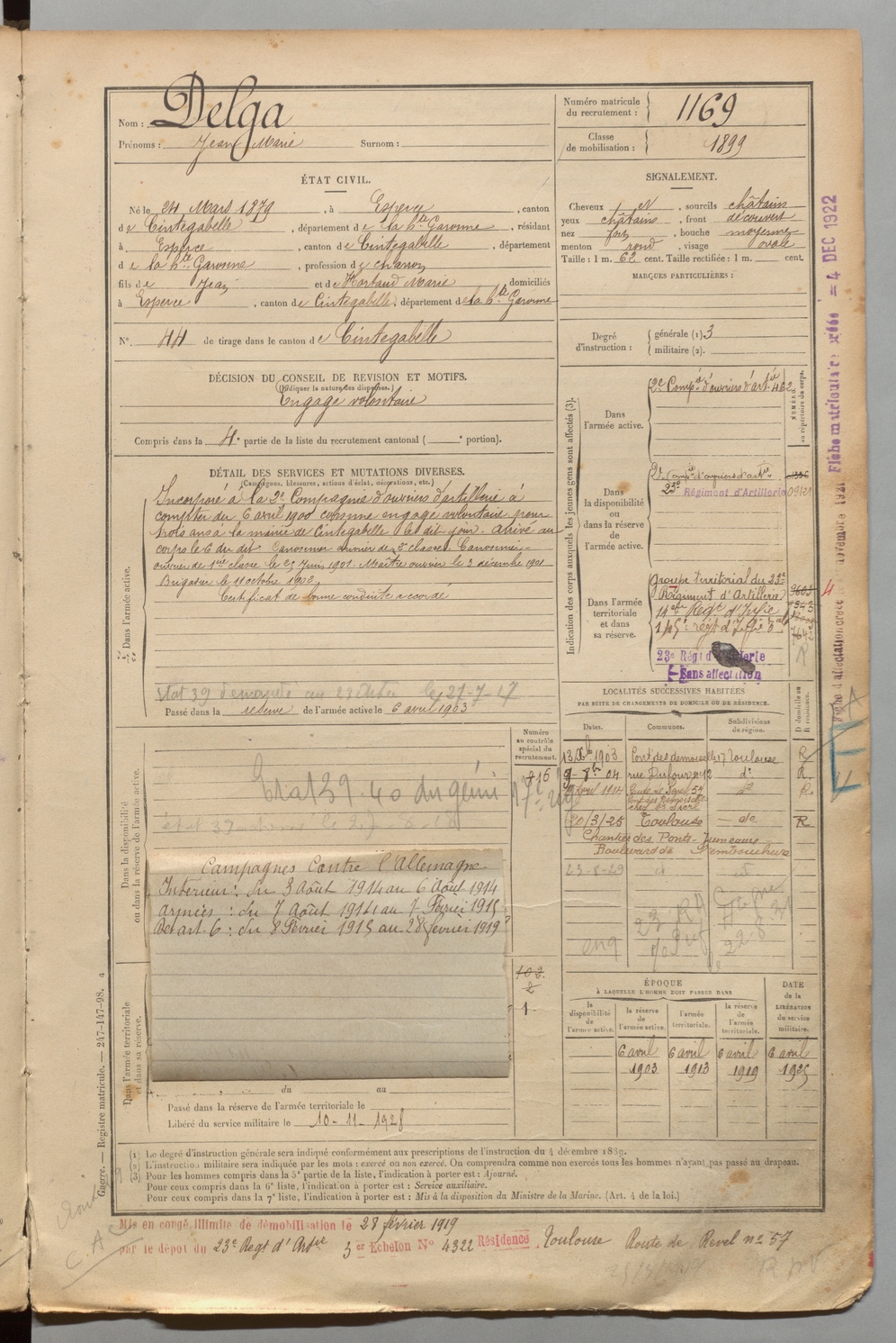 | Delga | Jean Marie | FOIX | 1 R 458 | 1899 | Esperce | Esperce | 1169 |