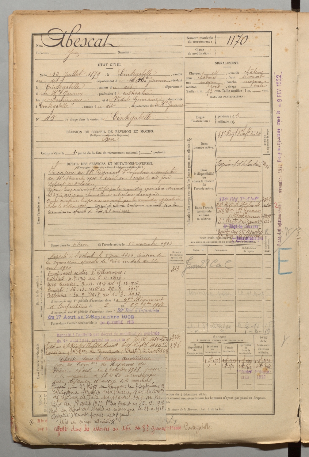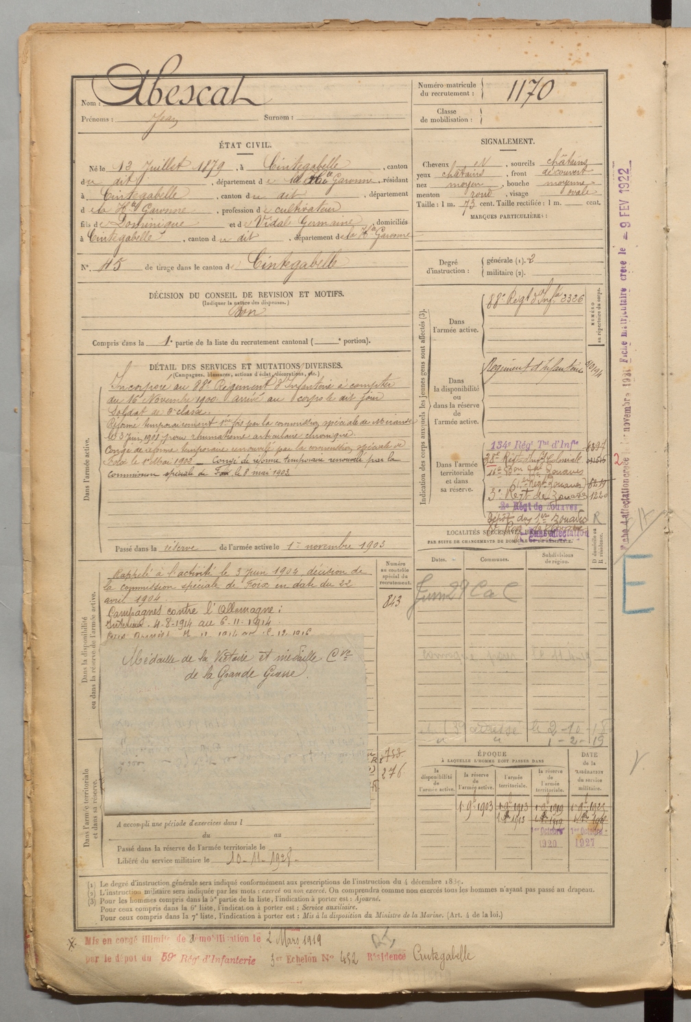 | Abescat | Jean | FOIX | 1 R 458 | 1899 | Cintegabelle | Cintegabelle | 1170 |