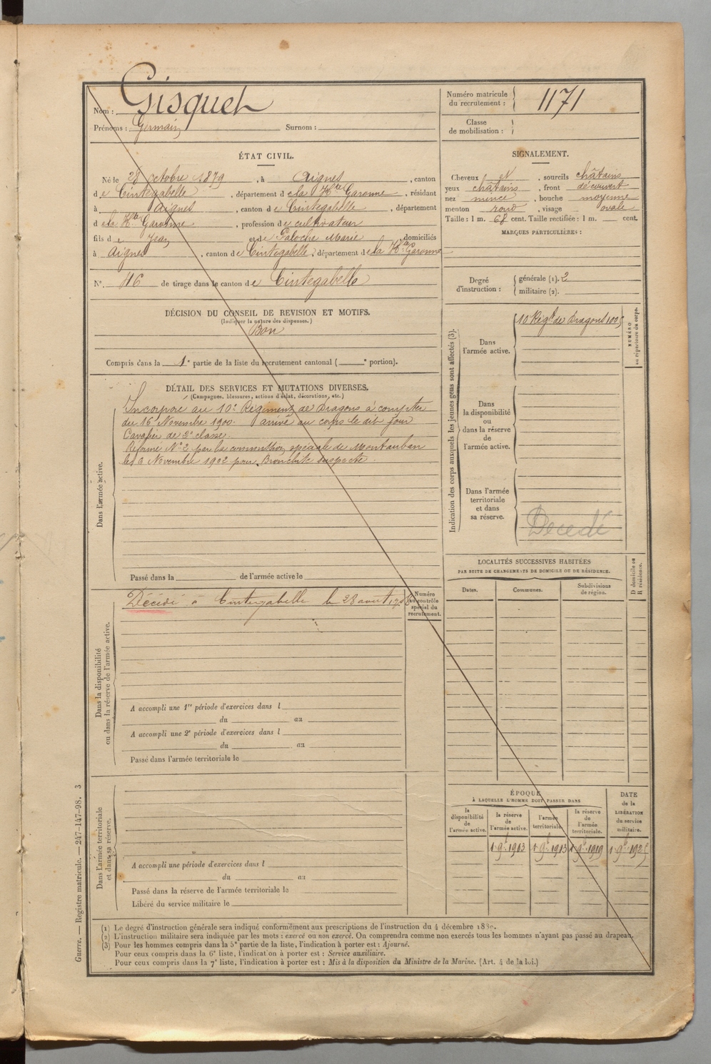 | Gisquet | Germain | FOIX | 1 R 458 | 1899 | Aignes | Aignes | 1171 |