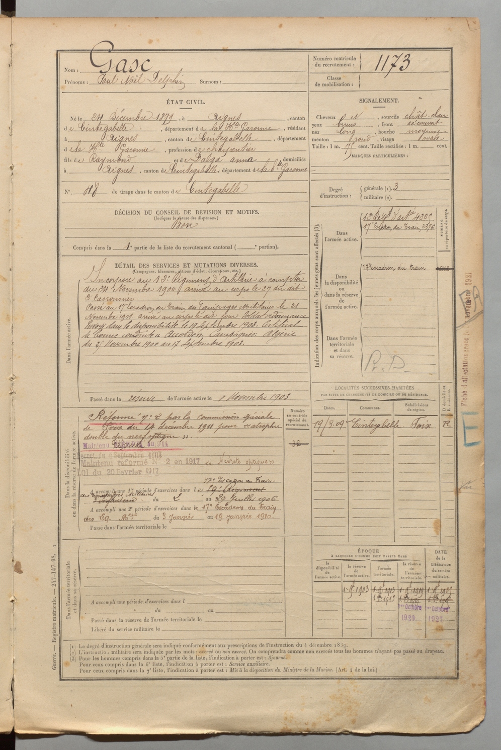 | Gasc | Paul Noël Delphin | FOIX | 1 R 458 | 1899 | Aignes | Aignes | 1173 |