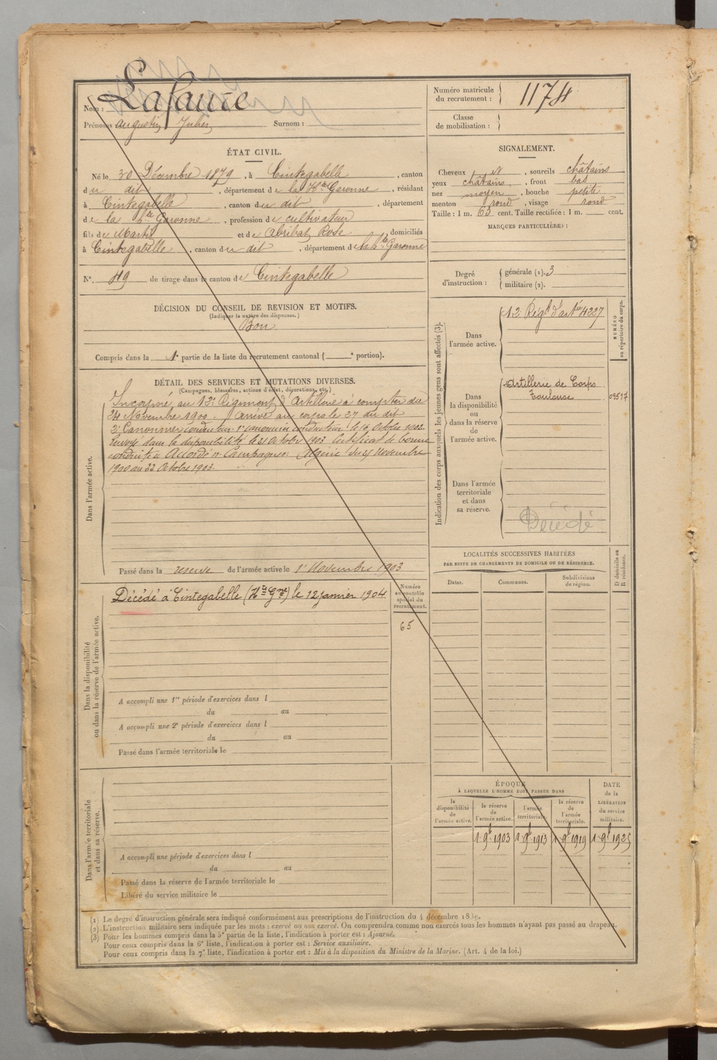 | Lafaure | Augustin Julien | FOIX | 1 R 458 | 1899 | Cintegabelle | Cintegabelle | 1174 |