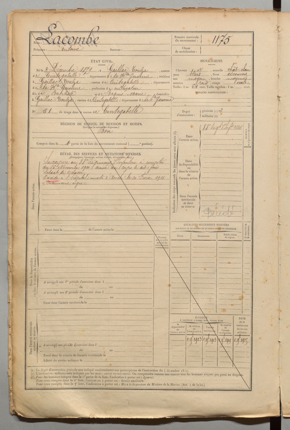 | Lacombe | Antoine | FOIX | 1 R 458 | 1899 | Gaillac-Toulza | Gaillac-Toulza | 1175 |