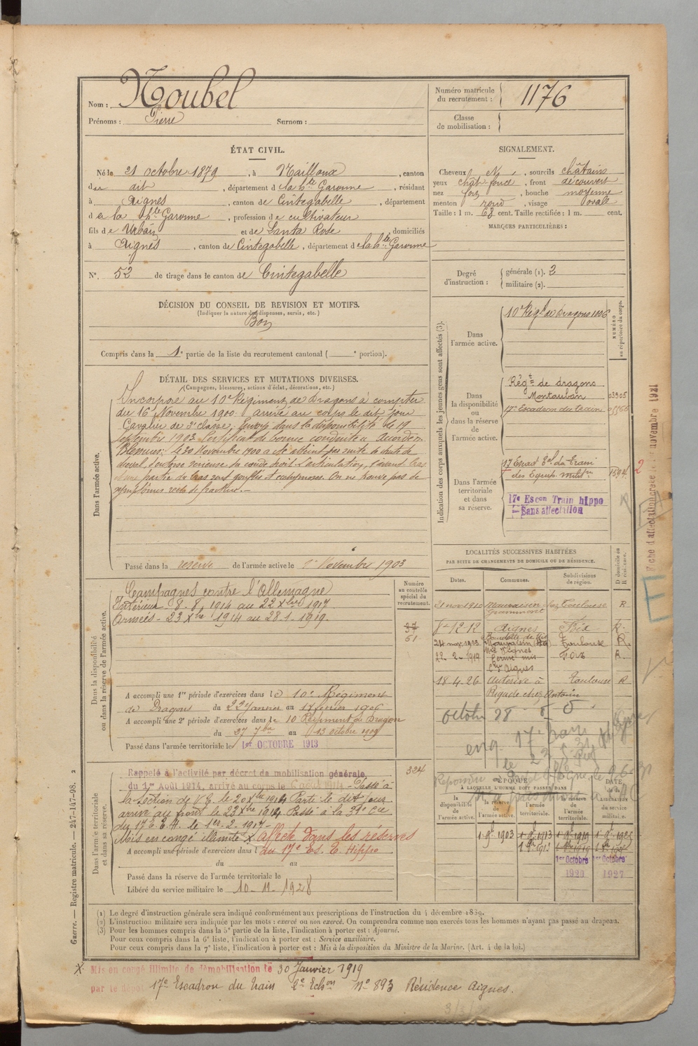 | Noubel | Pierre | FOIX | 1 R 458 | 1899 | Nailloux | Aignes | 1176 |