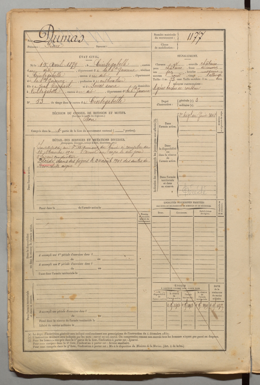 | Dumas | Pierre | FOIX | 1 R 458 | 1899 | Cintegabelle | Cintegabelle | 1177 |