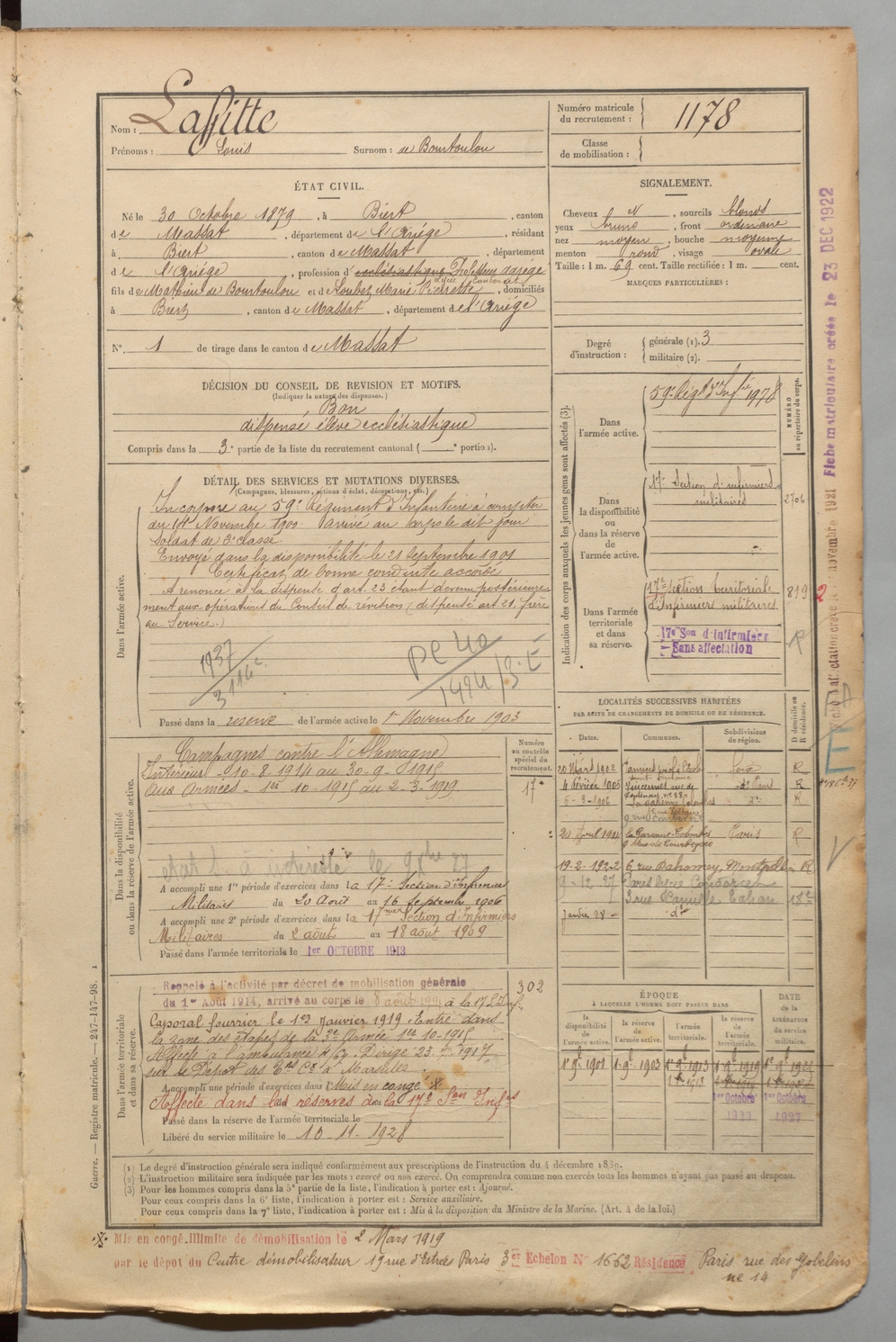 | Laffitte | Louis dit De Bourtoulou | FOIX | 1 R 458 | 1899 | Biert | Biert | 1178 |