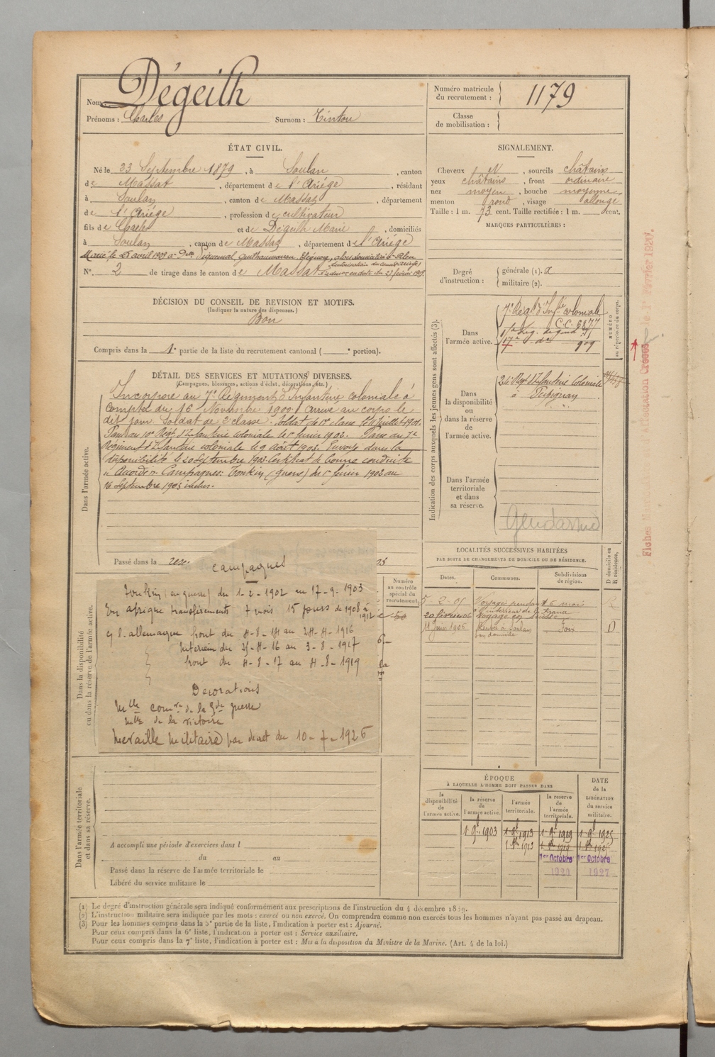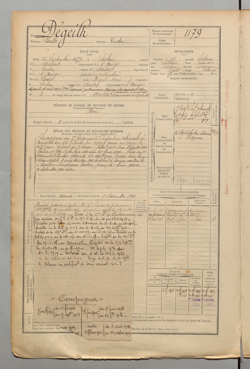 | Dégeilh | Charles dit Tintou | FOIX | 1 R 458 | 1899 | Soulan | Soulan | 1179 |