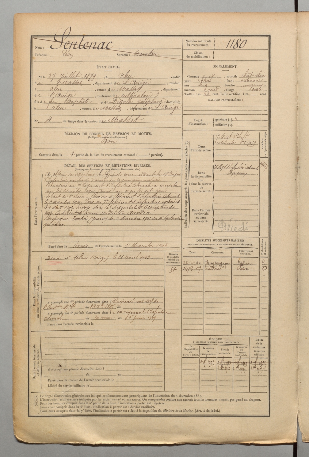 | Sentenac | Léon dit Baratou | FOIX | 1 R 458 | 1899 | Aleu | Aleu | 1180 |