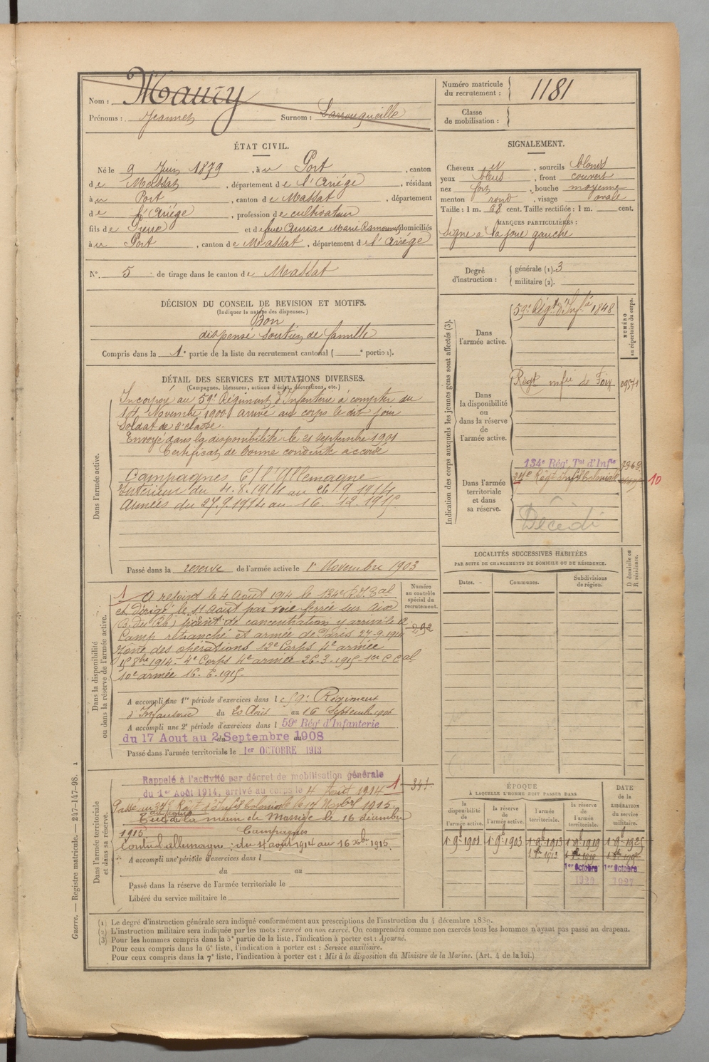 | Maury | Jeannet dit Larrouqueille | FOIX | 1 R 458 | 1899 | Port (Le) | Port (Le) | 1181 |