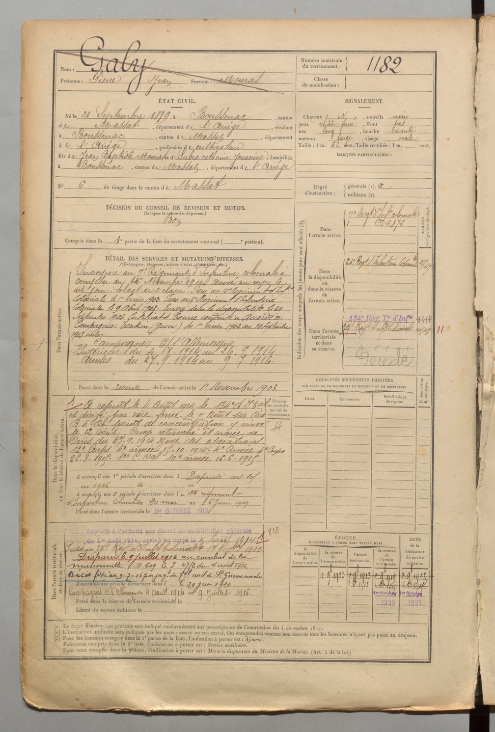 | Galy | Pierre Jean dit Mouras | FOIX | 1 R 458 | 1899 | Boussenac | Boussenac | 1182 |