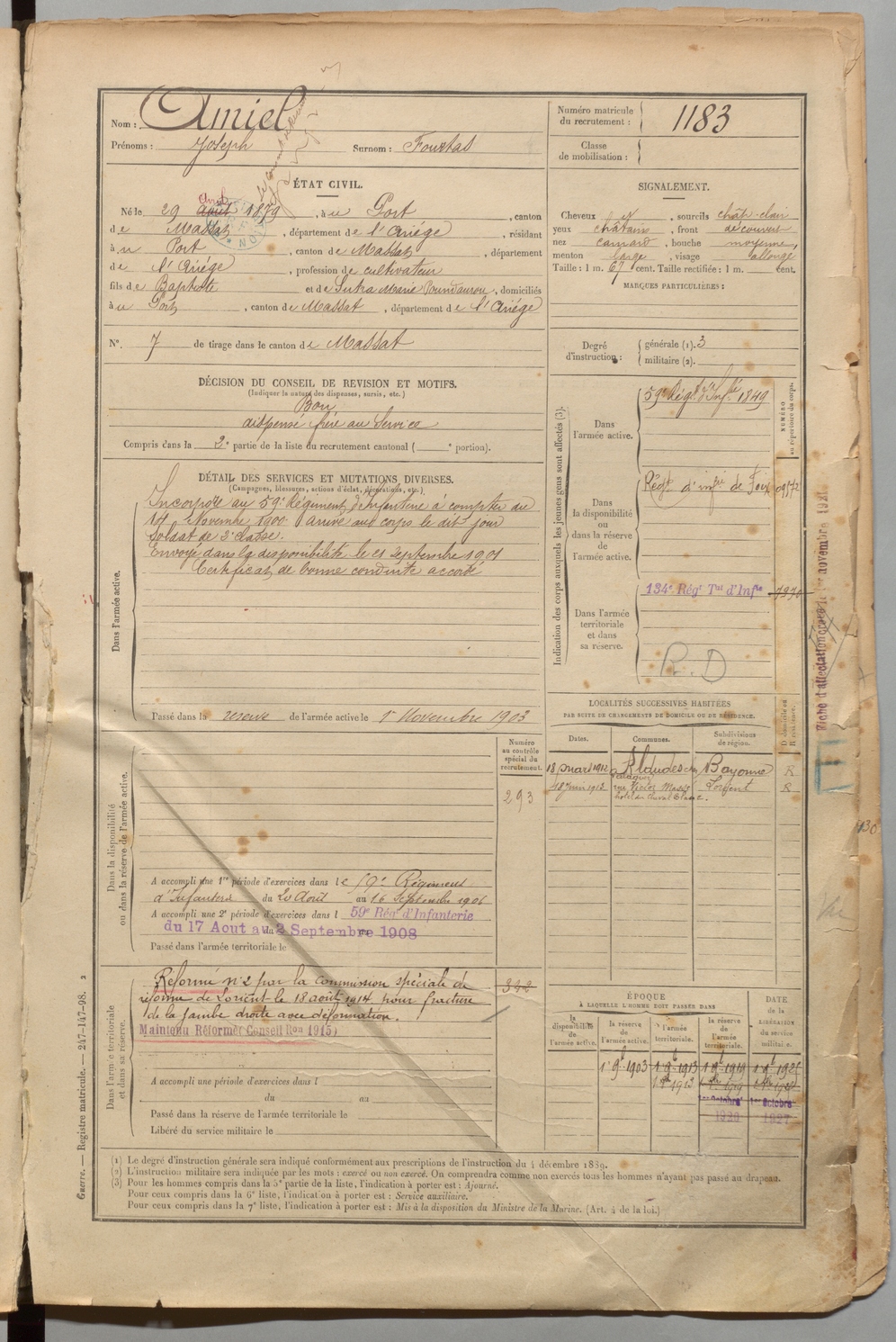 | Amiel | Joseph dit Fourtas | FOIX | 1 R 458 | 1899 | Port (Le) | Port (Le) | 1183 |