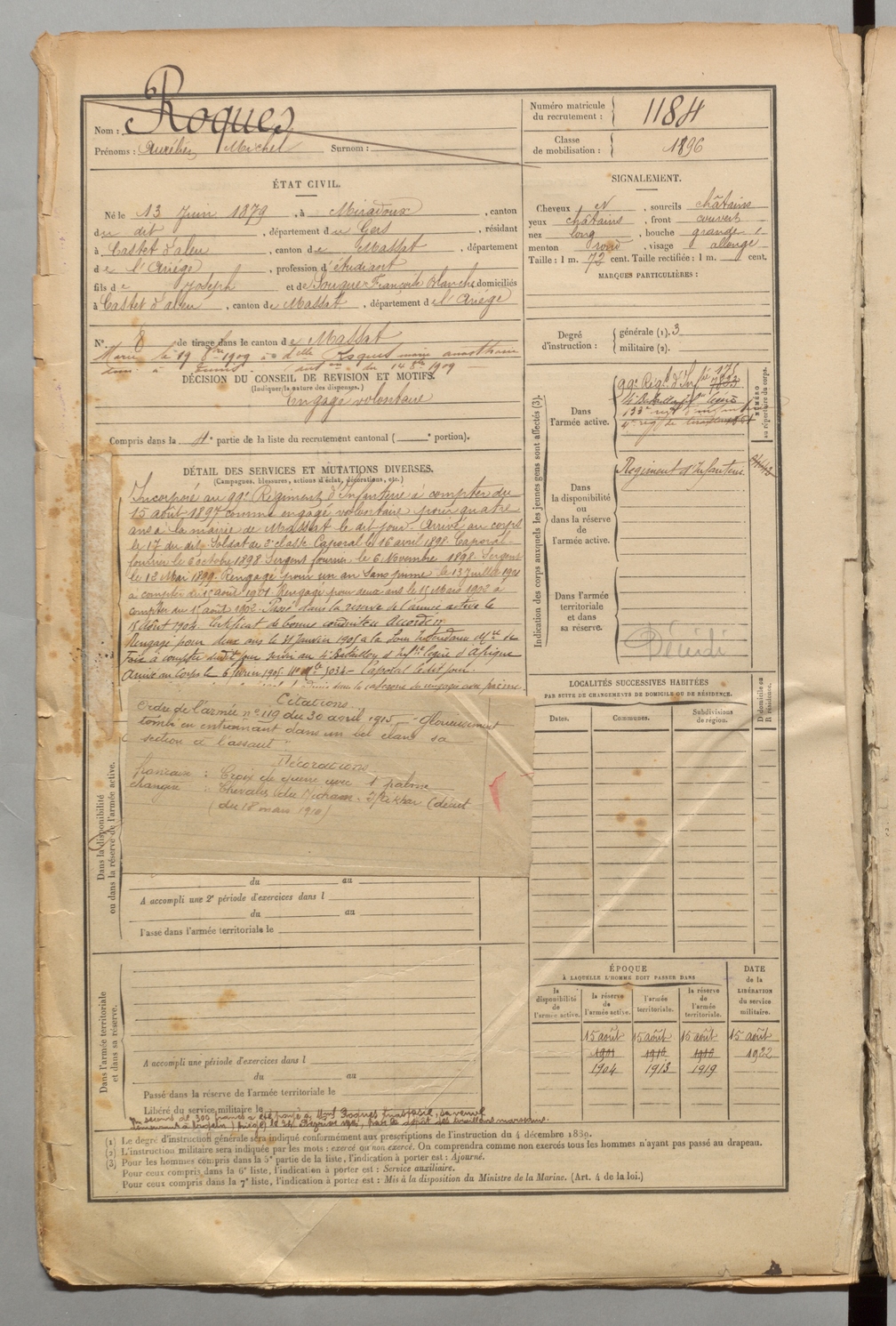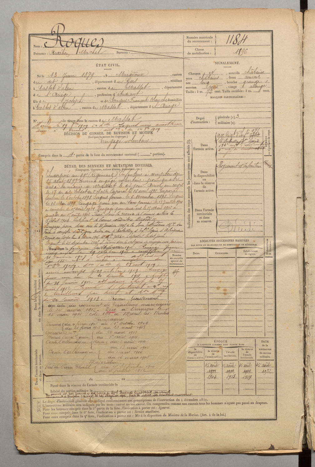| Roques | Aurélien Michel | FOIX | 1 R 458 | 1899 | Miradoux | Castet d'Aleu | 1184 |