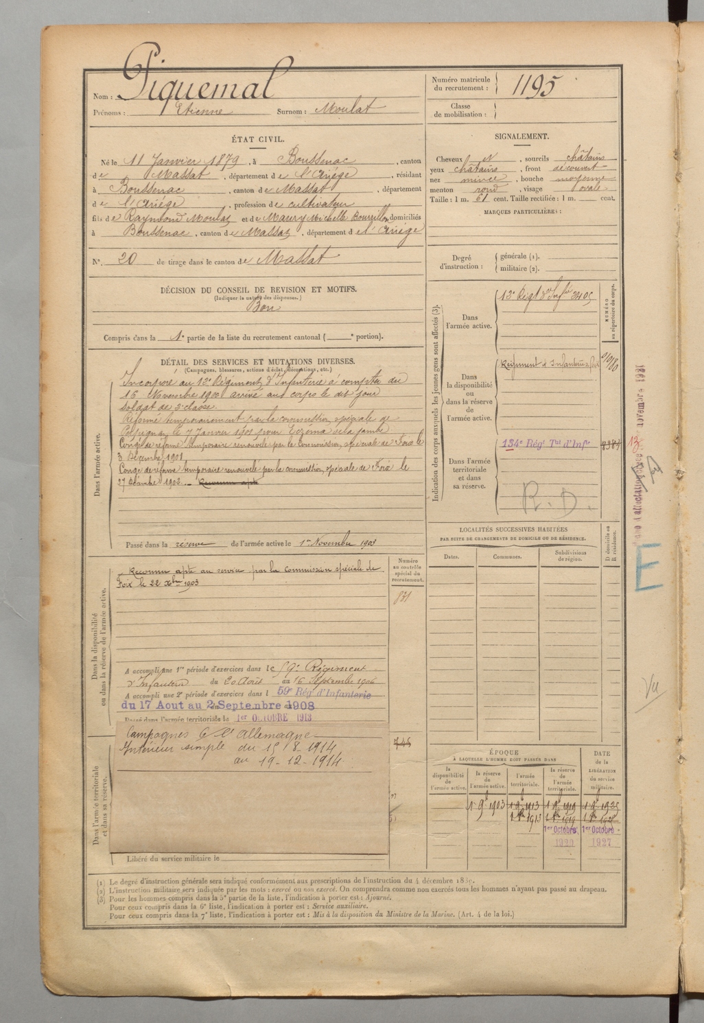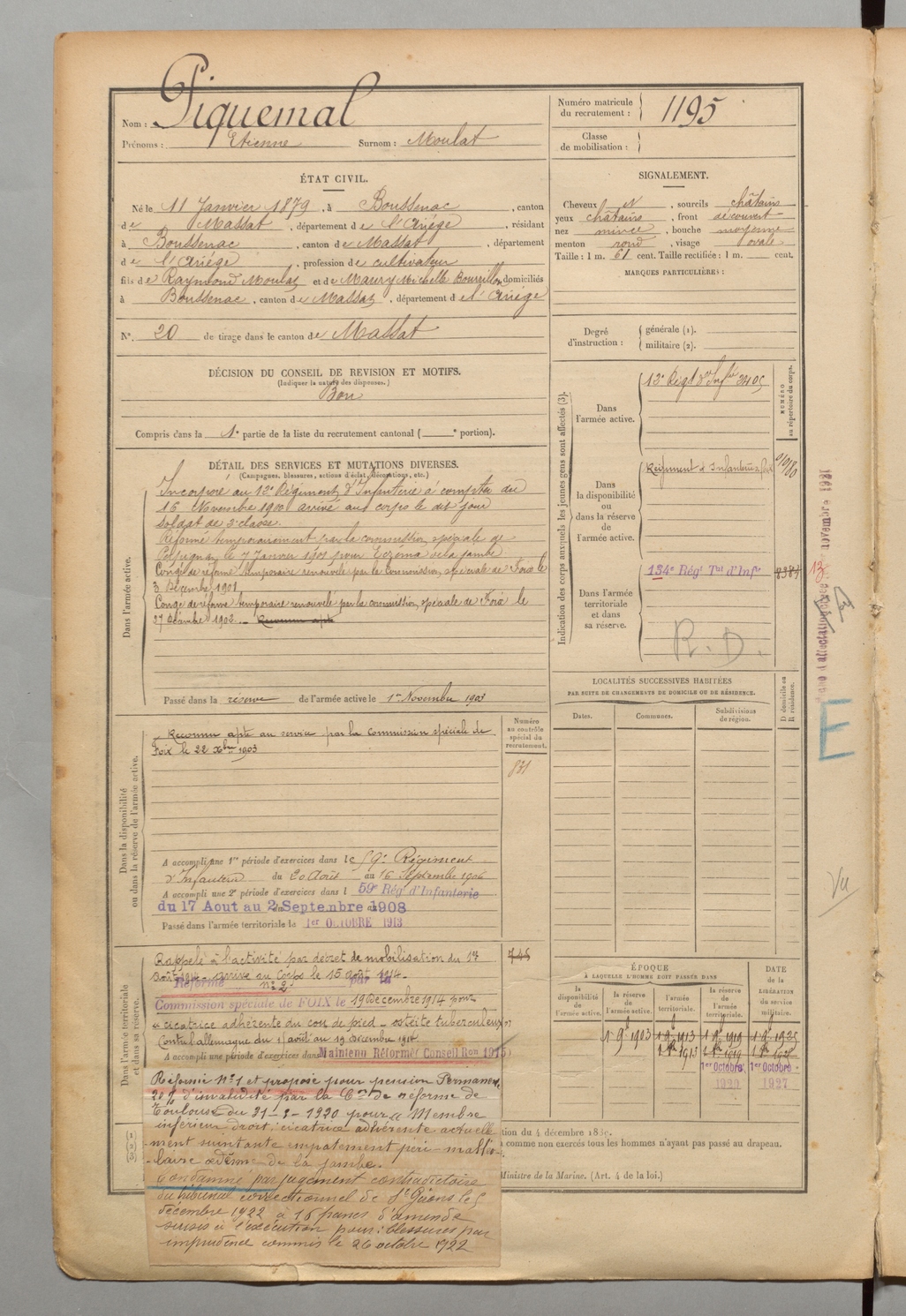 | Piquemal | Etienne dit Moulat | FOIX | 1 R 458 | 1899 | Boussenac | Boussenac | 1195 |