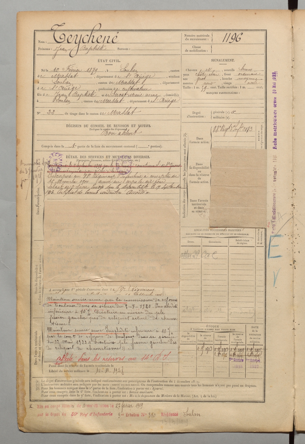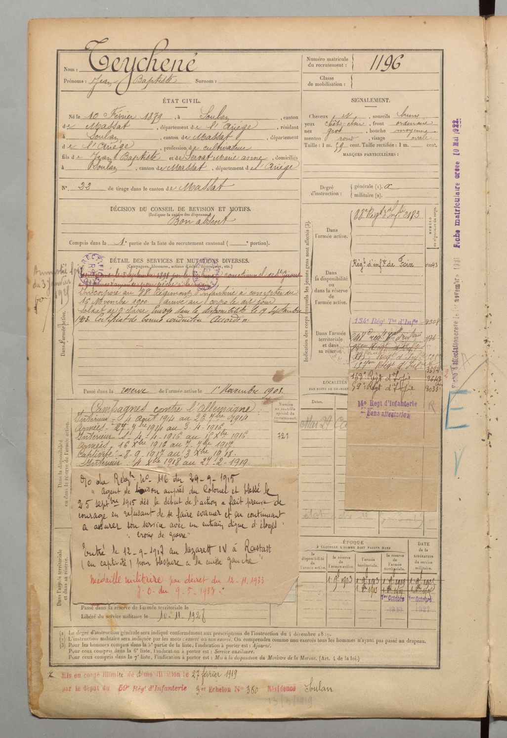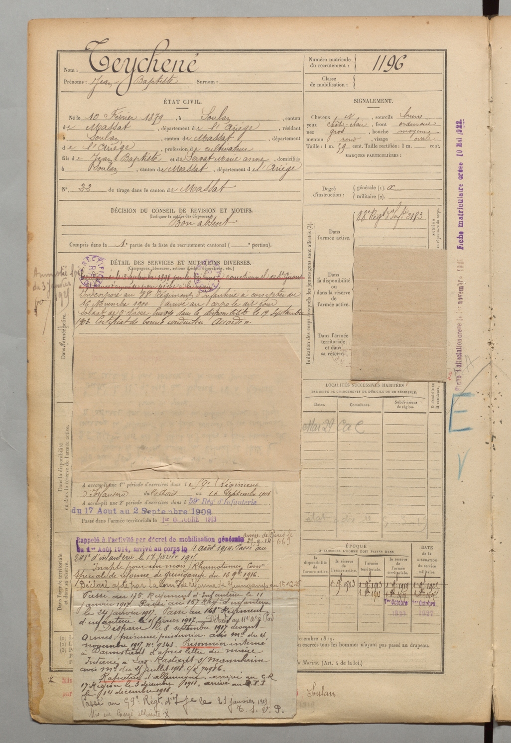 | Teychené | Jean Baptiste | FOIX | 1 R 458 | 1899 | Soulan | Soulan | 1196 |