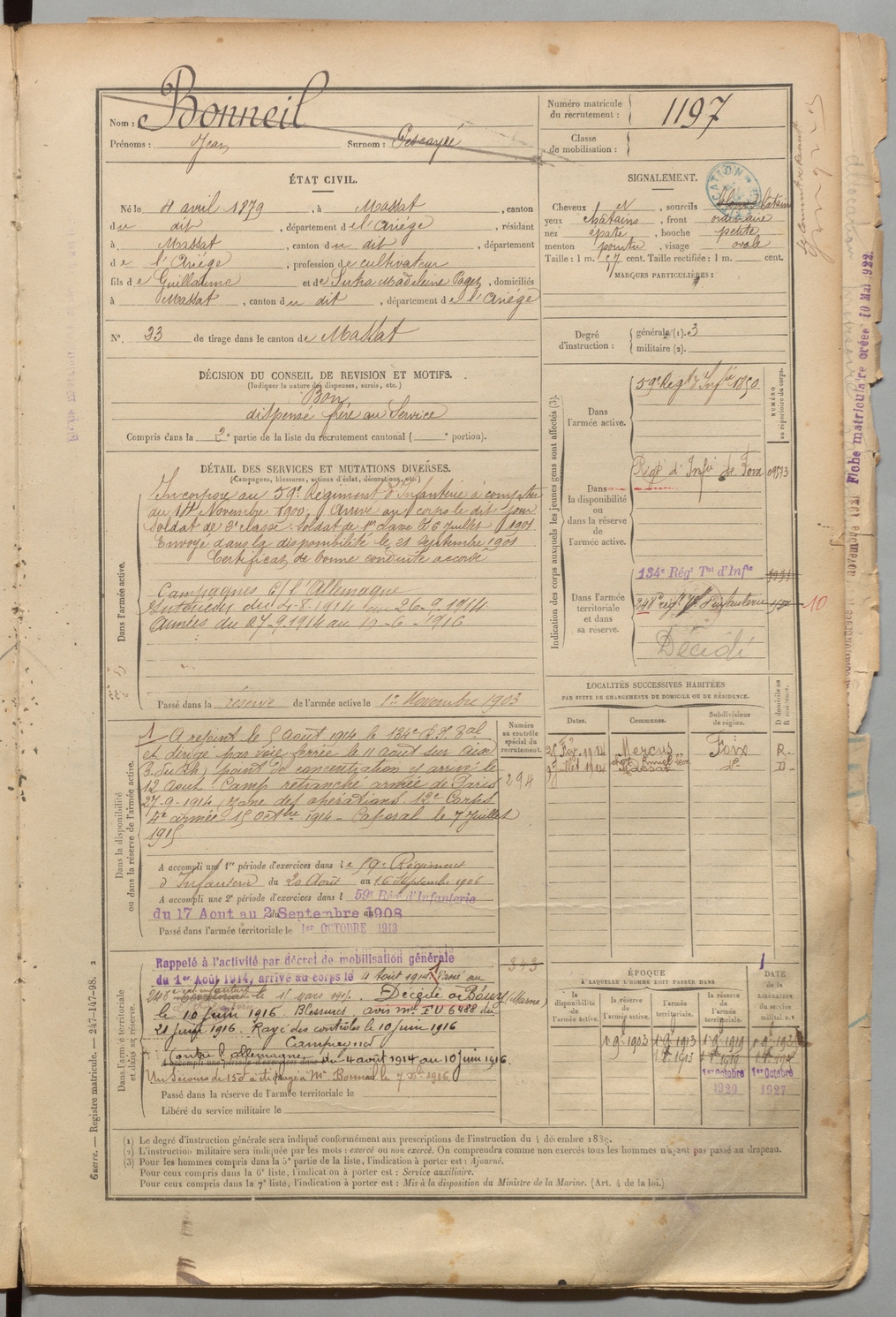 | Bonneil | Jean dit Pescayré | FOIX | 1 R 458 | 1899 | Massat | Massat | 1197 |