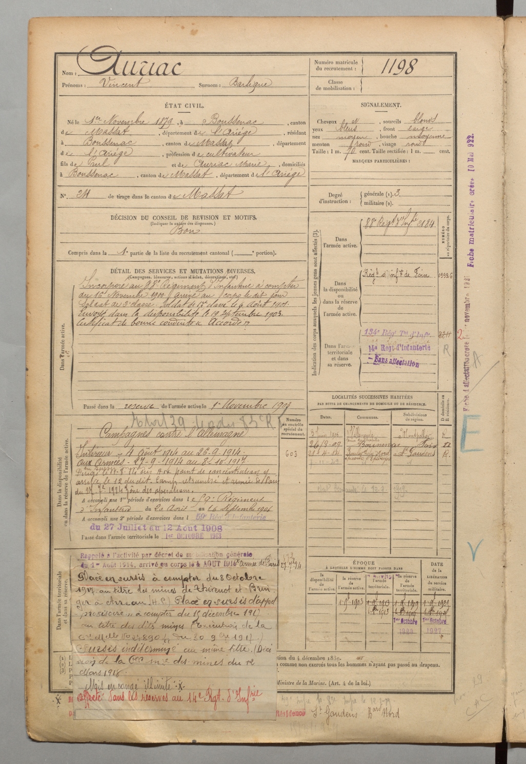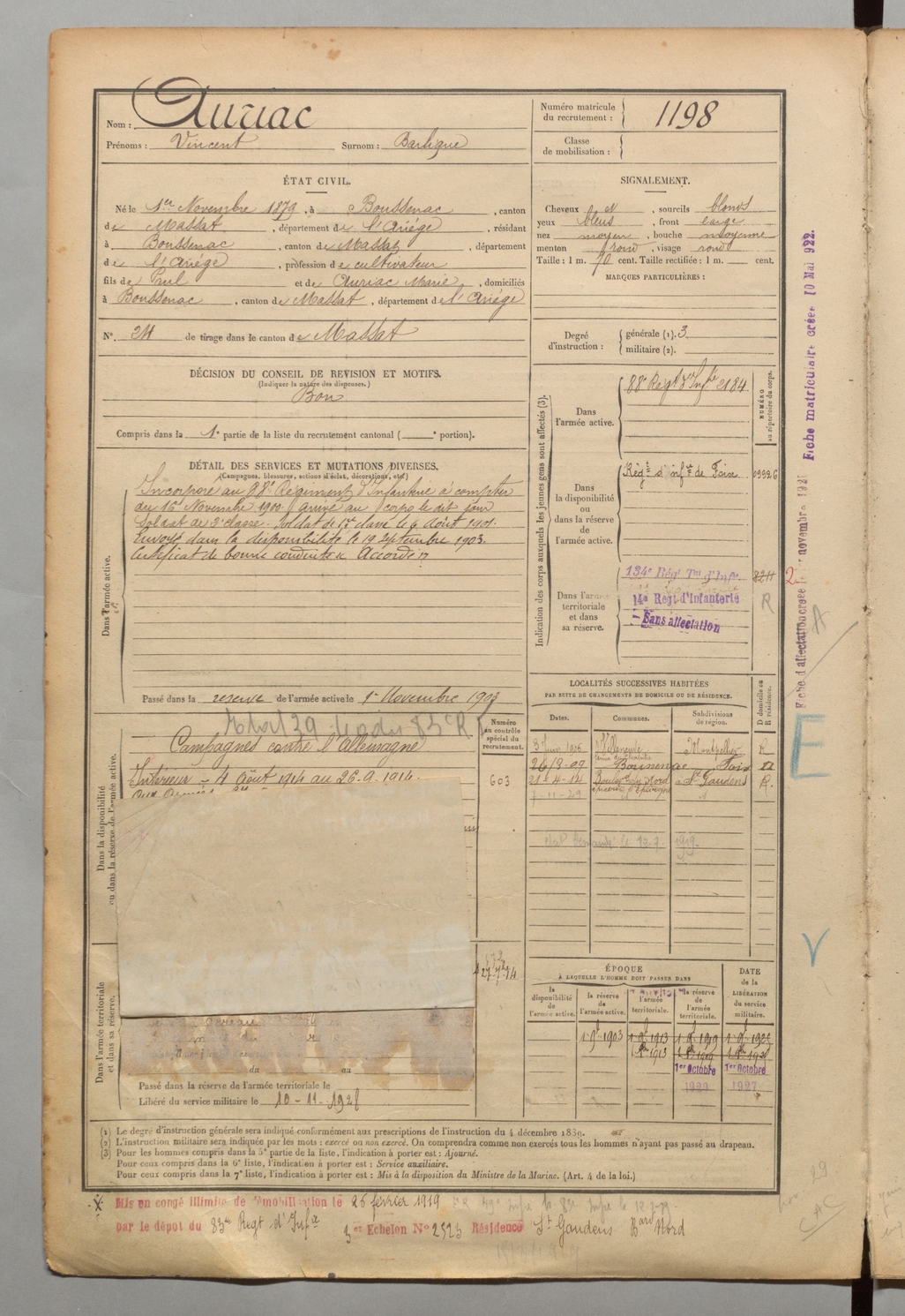 | Auriac | Vincent dit Barlique | FOIX | 1 R 458 | 1899 | Boussenac | Boussenac | 1198 |