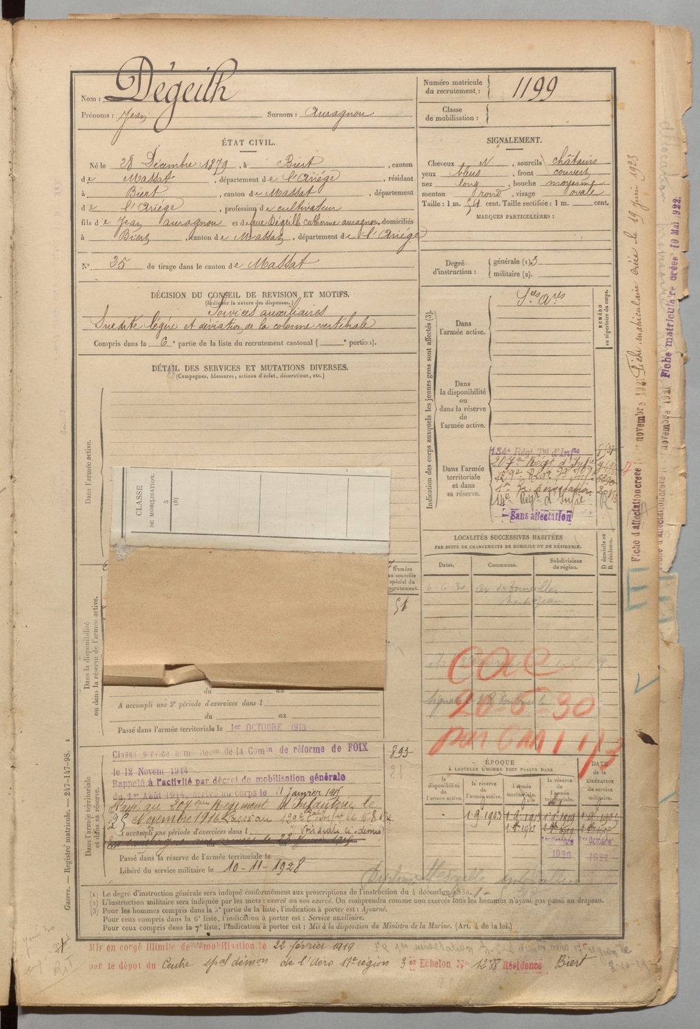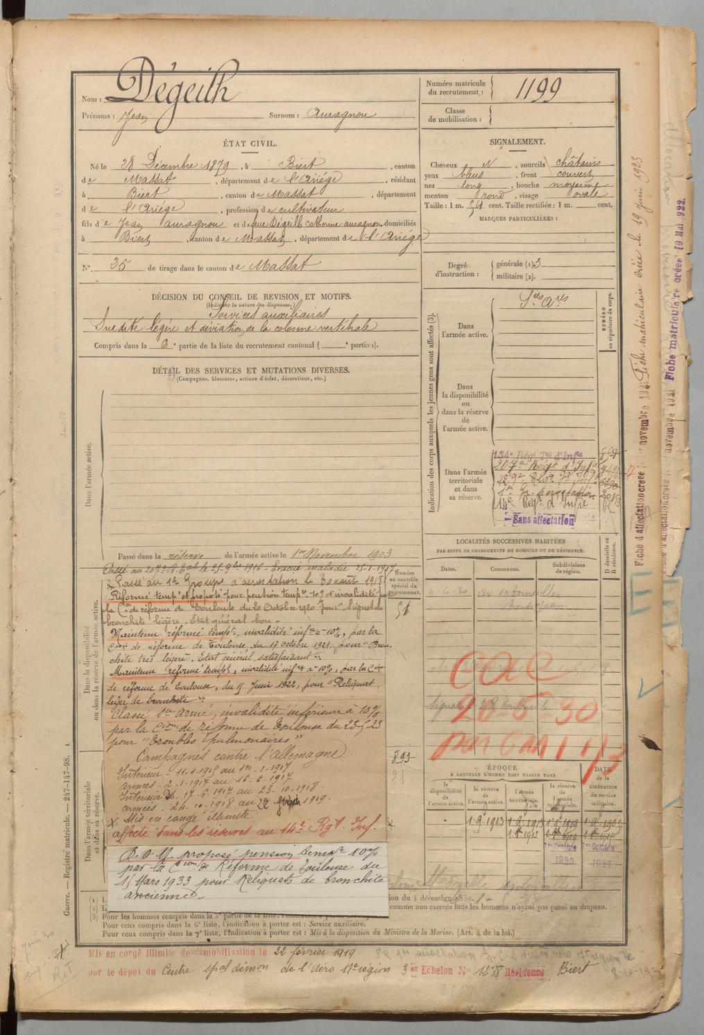 | Dégeilh | Jean dit Auragnou | FOIX | 1 R 458 | 1899 | Biert | Biert | 1199 |