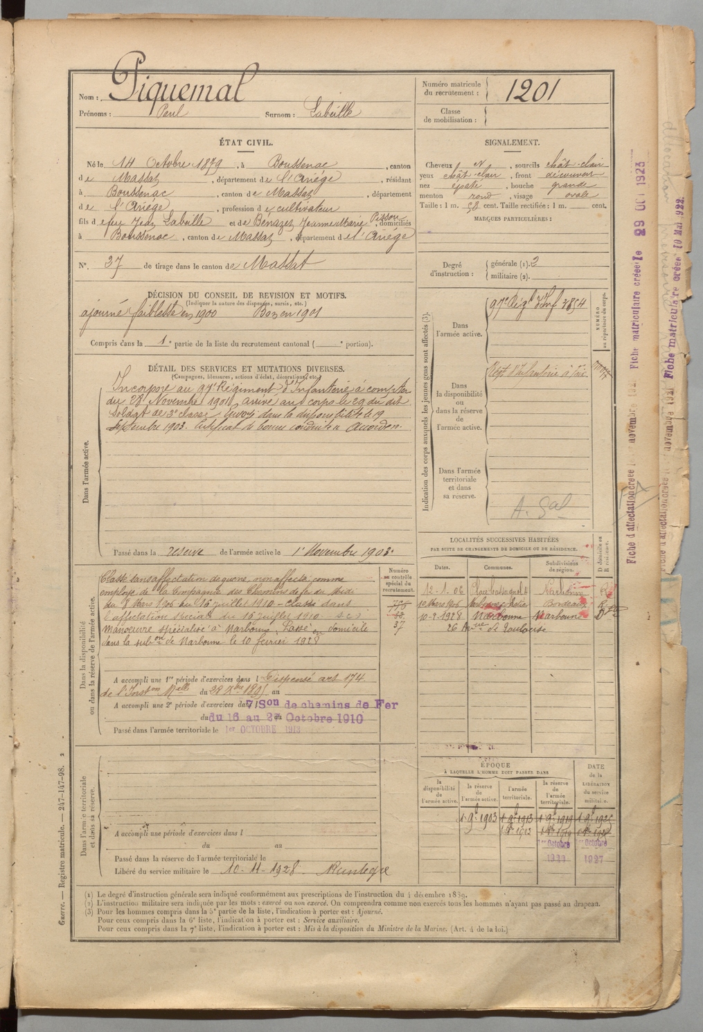 | Piquemal | Paul dit Labeille | FOIX | 1 R 458 | 1899 | Boussenac | Boussenac | 1201 |