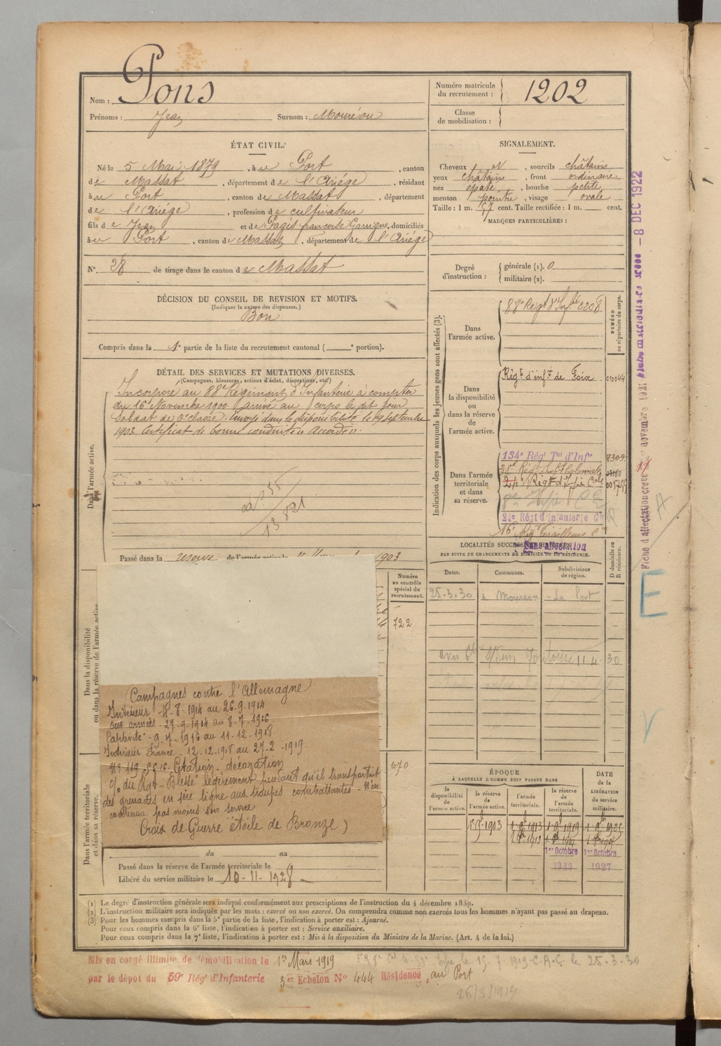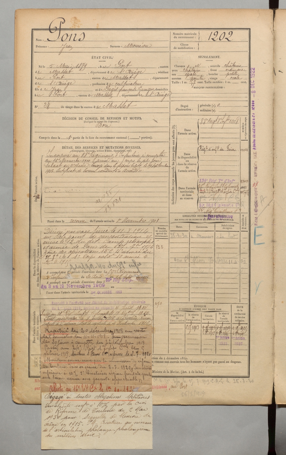 | Pons | Jean dit Mouréou | FOIX | 1 R 458 | 1899 | Port (Le) | Port (Le) | 1202 |