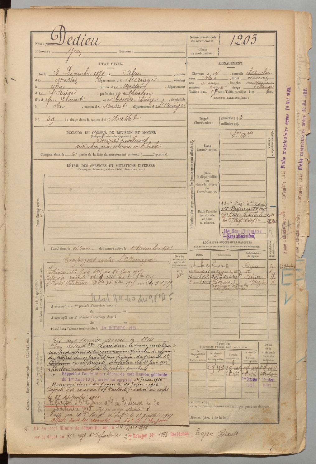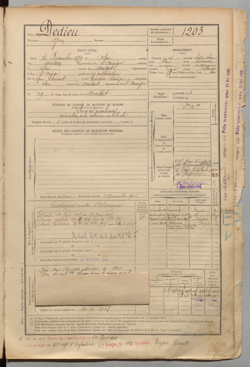 | Dedieu | Jean | FOIX | 1 R 458 | 1899 | Aleu | Aleu | 1203 |