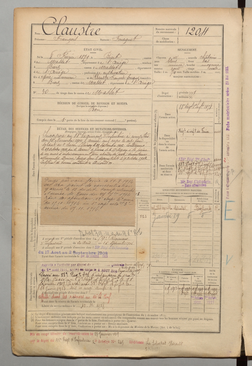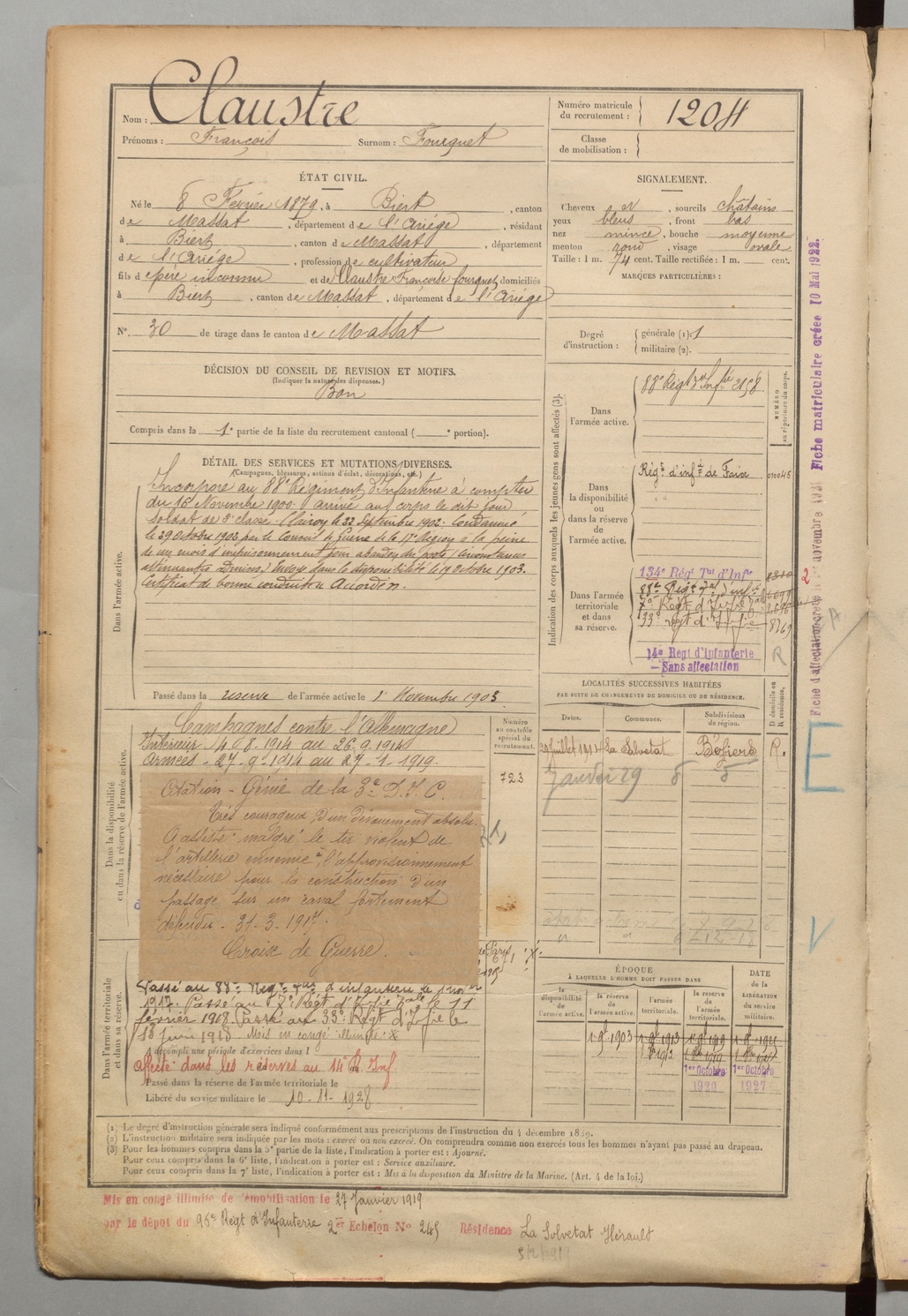 | Claustre | François dit Fourquet | FOIX | 1 R 458 | 1899 | Biert | Biert | 1204 |