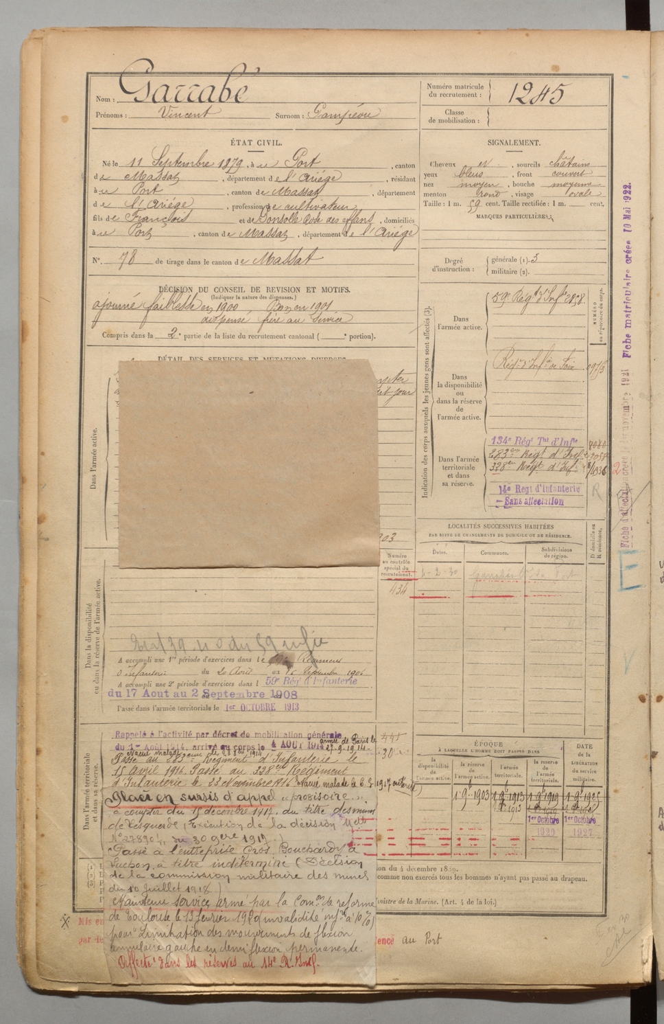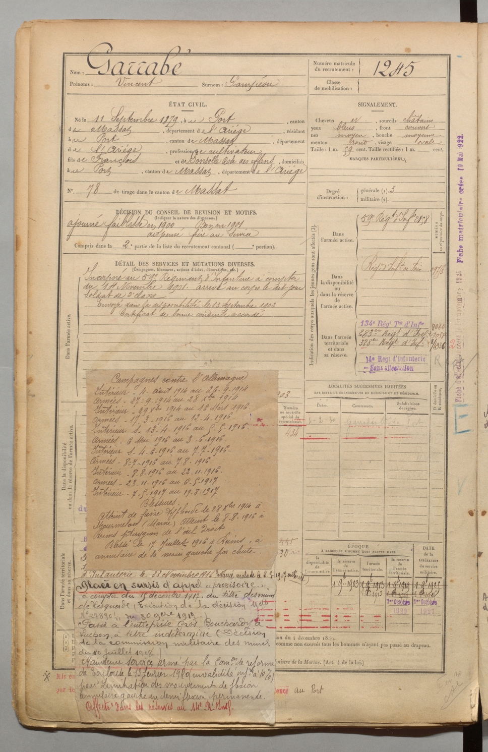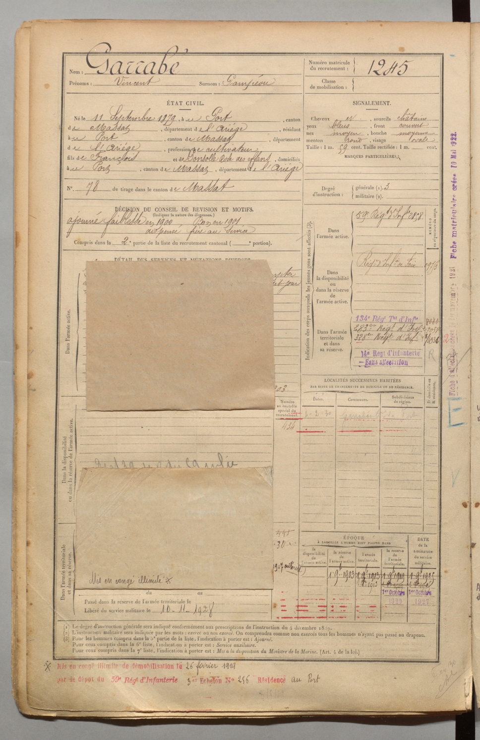 | Garrabé | Vincent dit Pampéou | FOIX | 1 R 458 | 1899 | Port (Le) | Port (Le) | 1245 |