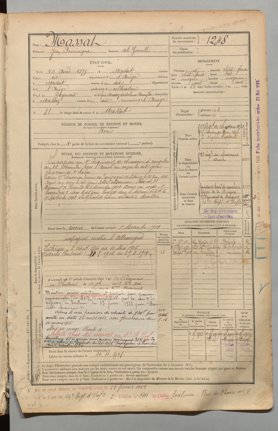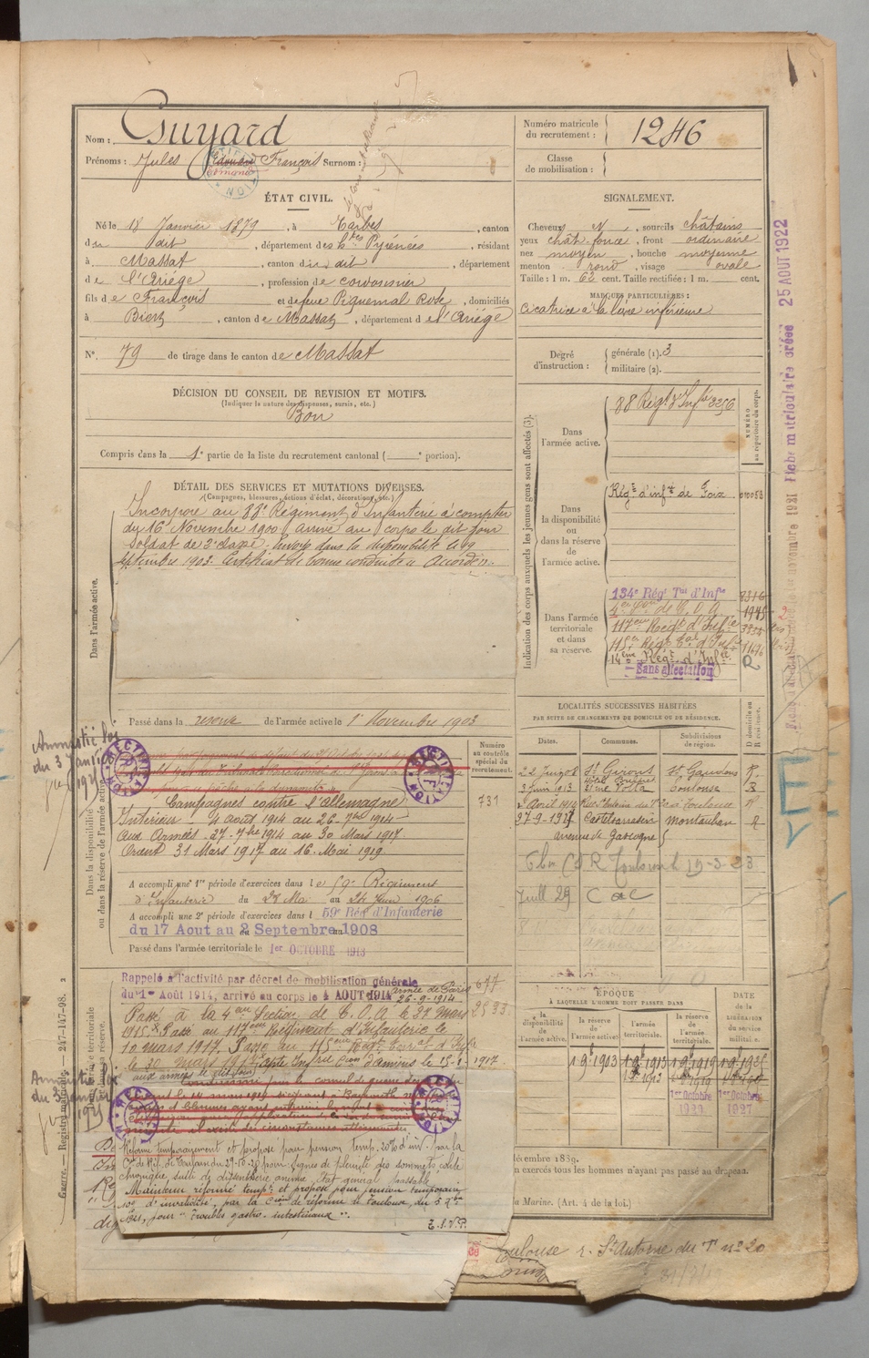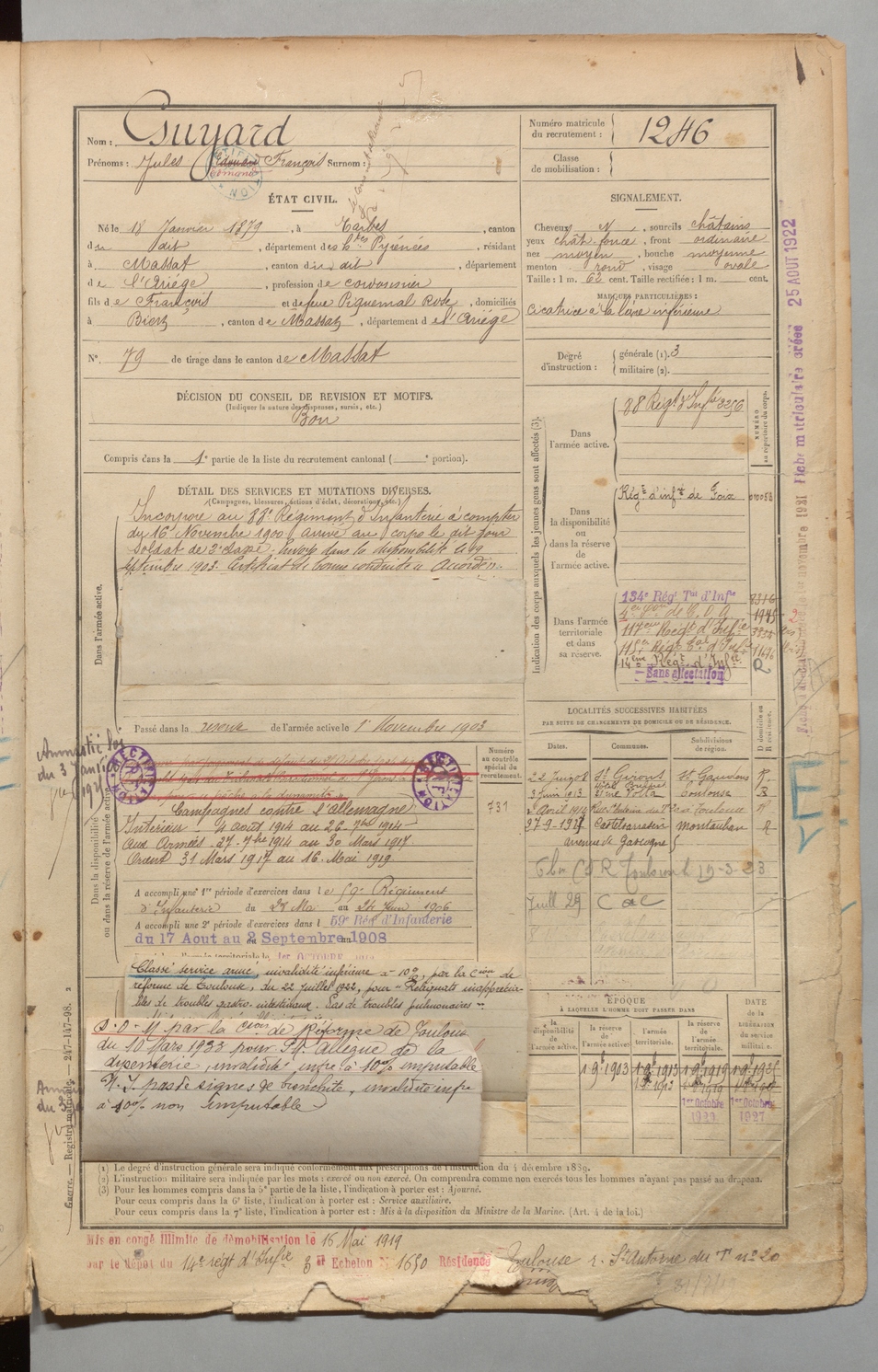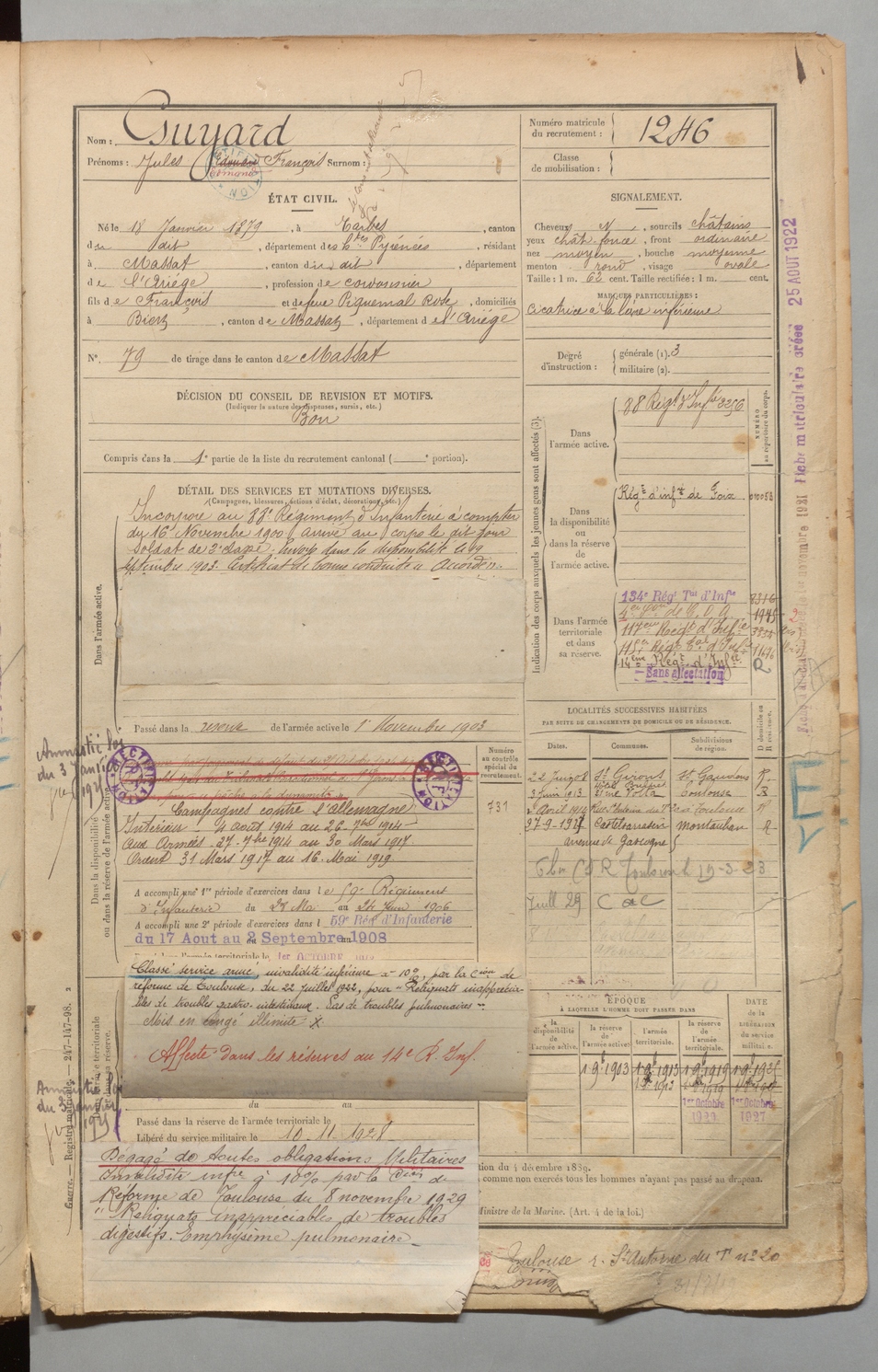| Guyard | Jules Edmond François | FOIX | 1 R 458 | 1899 | Tarbes | Massat | 1246 |