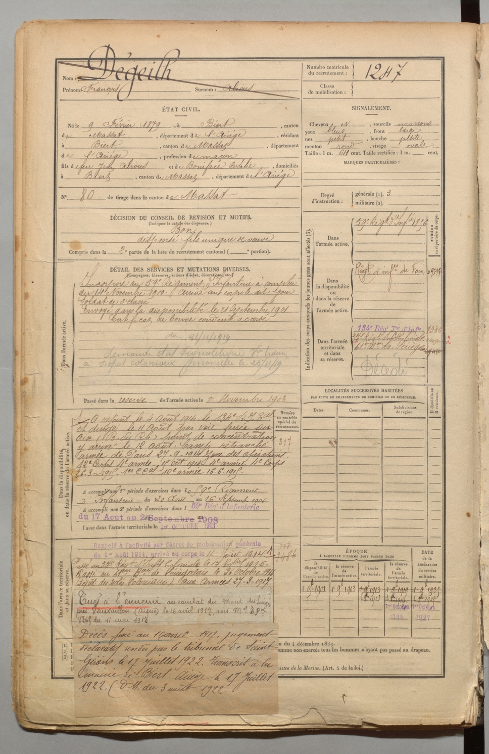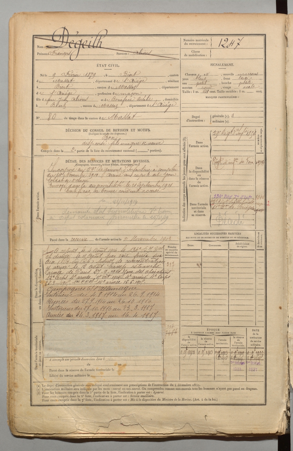 | Dégeilh | François dit Alious | FOIX | 1 R 458 | 1899 | Biert | Biert | 1247 |