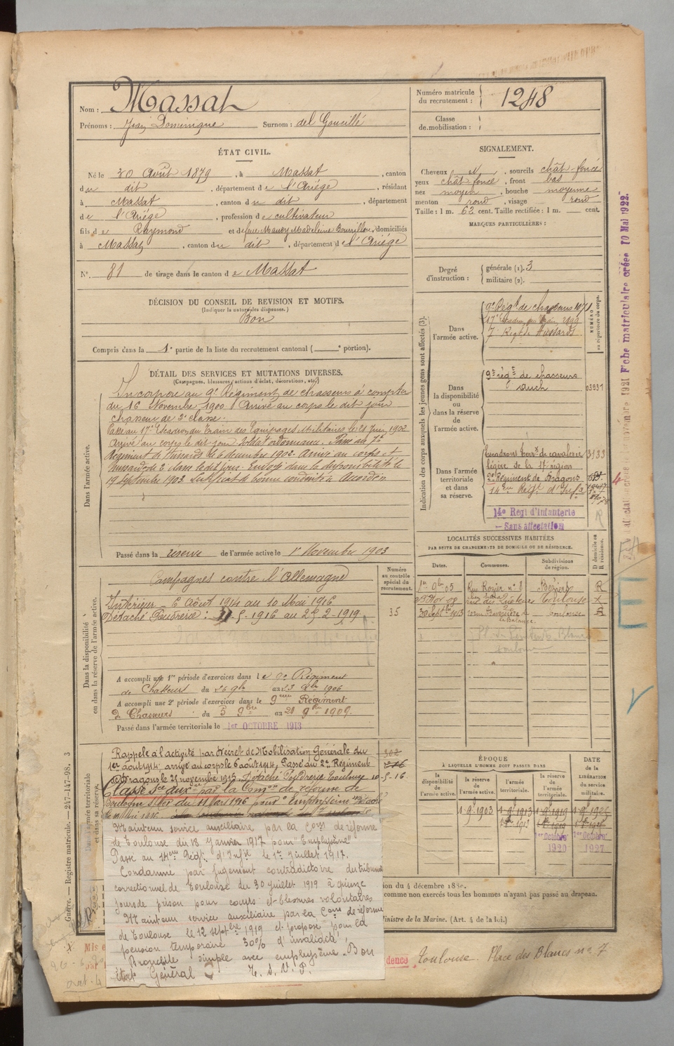 | Massat | Jean Dominique dit Del Goucillé | FOIX | 1 R 458 | 1899 | Massat | Massat | 1248 |