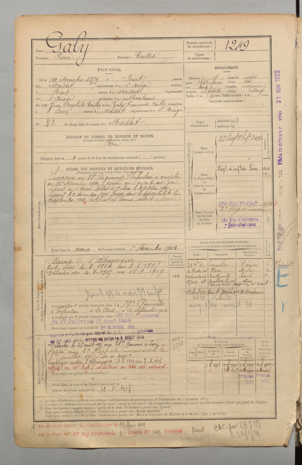 | Galy | Pierre dit Caillet | FOIX | 1 R 458 | 1899 | Biert | Biert | 1249 |