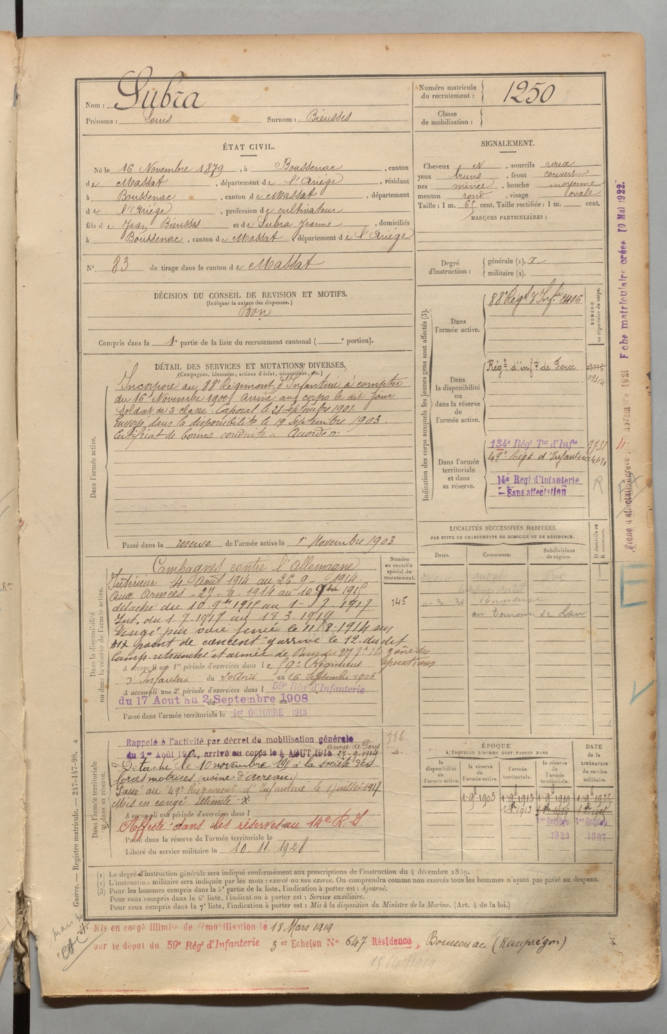| Subra | Louis dit Bieusses | FOIX | 1 R 458 | 1899 | Boussenac | Boussenac | 1250 |