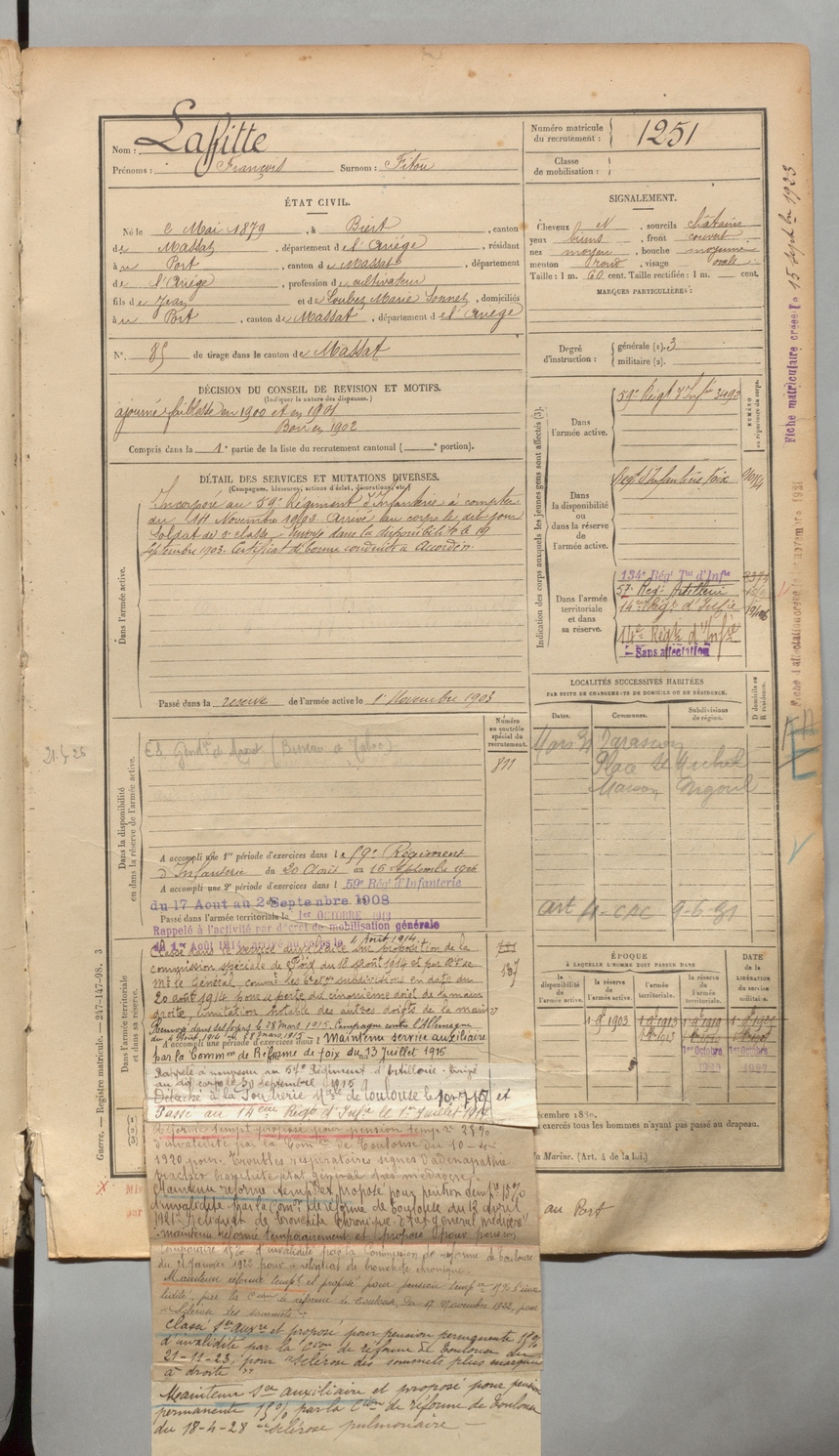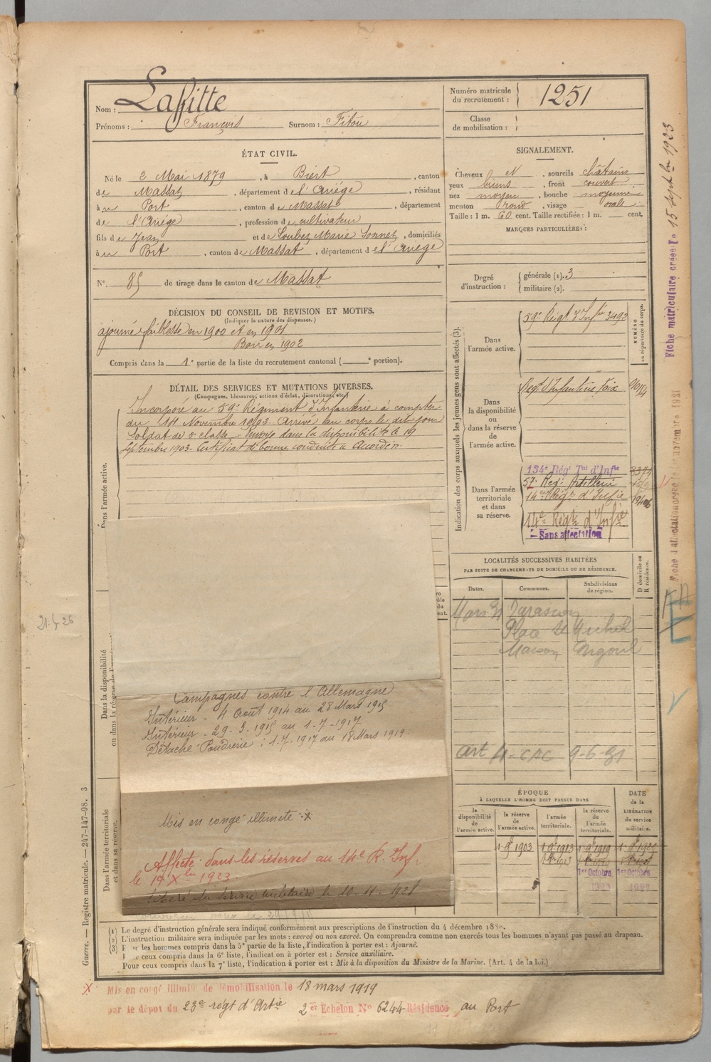 | Laffitte | François dit Fitou | FOIX | 1 R 458 | 1899 | Biert | Port (Le) | 1251 |